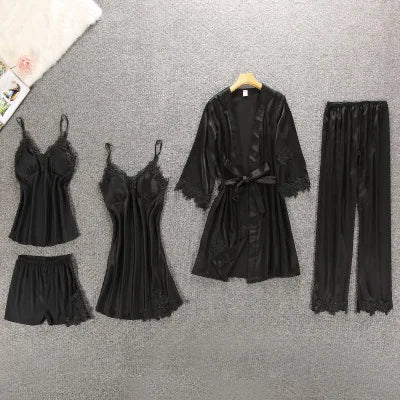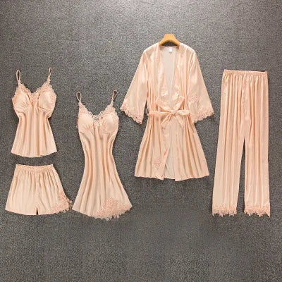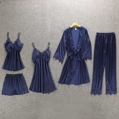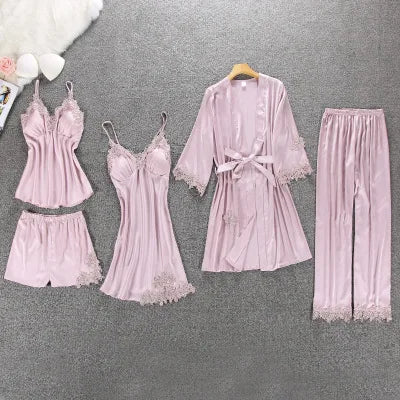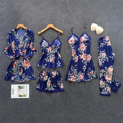 Daeyard Women's Pajamas Silk Floral Overall Print 5Pcs Pajama Set Satin Pyjamas Sexy Lace Pijama Nightie Sleepwear Home Clothes