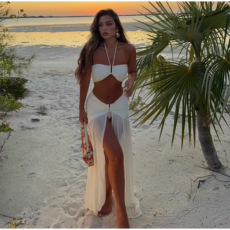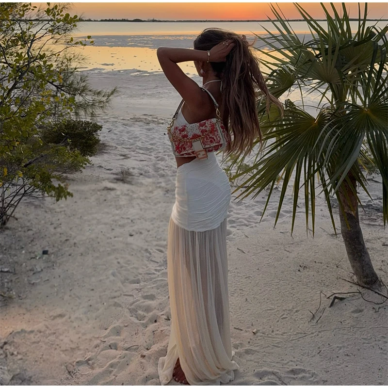 Hollow Out Backless Halter Split Long Dress Women Lace Up Off Shoulder Pleated Patchwork Holiday Dresses Party Sexy Beach Robe