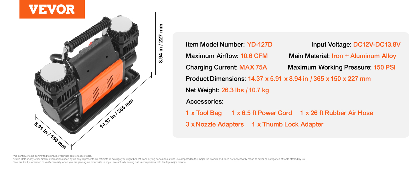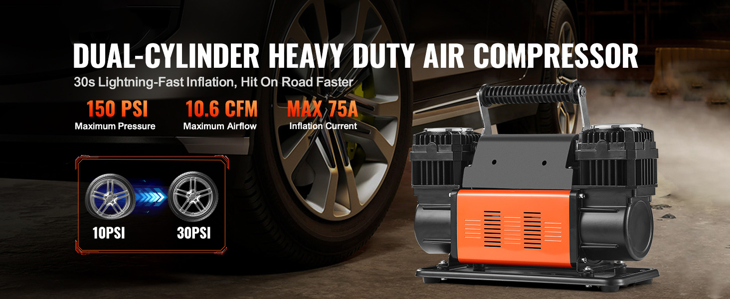Stay prepared with SucceBuy dual-cylinder heavy-duty air compressor — your reliable companion for 2X faster inflation. With upgraded dual cylinders, 150 PSI maximum pressure and 10.6 CFM high airflow, this portable tire inflator ensures you get back on the road quickly, saving valuable time.
