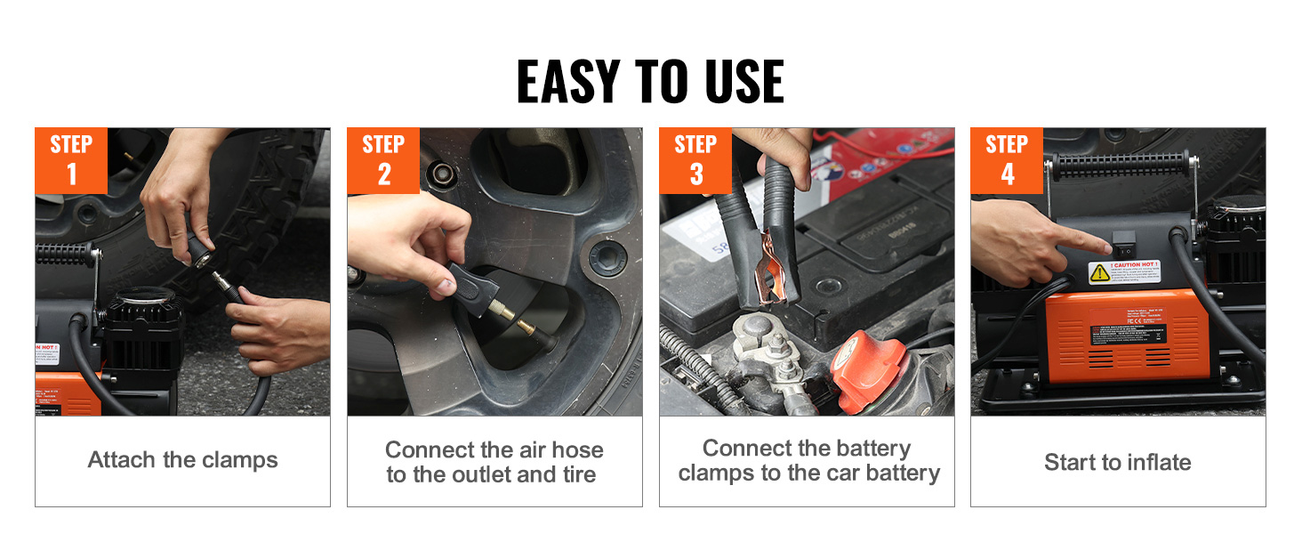 With a straightforward 4-step process — attach the clamps, connect the air hose to the air outlet and tire, attach the battery clamp to your vehicle's battery, and start inflation — completing your inflation tasks is effortless and hassle-free.
