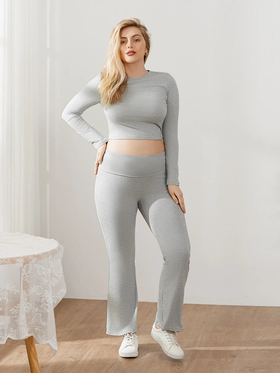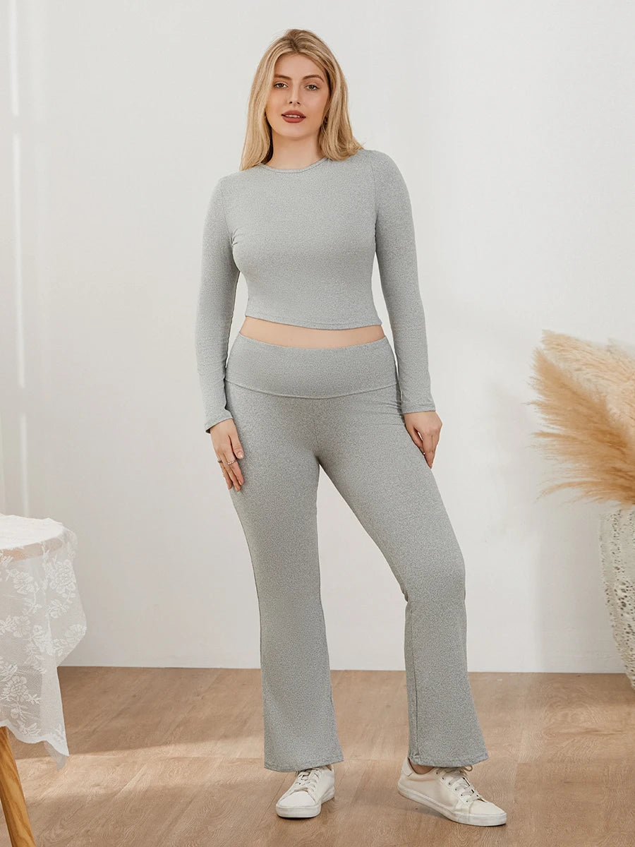 Women's Pants Outfits Solid Color Long Sleeve Boat Neck Crop Tops with Fold Over Trousers Set StreetwearSize (cm)
