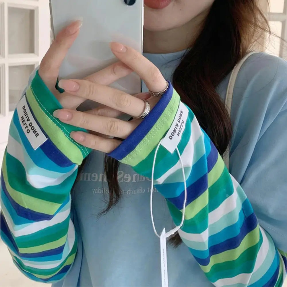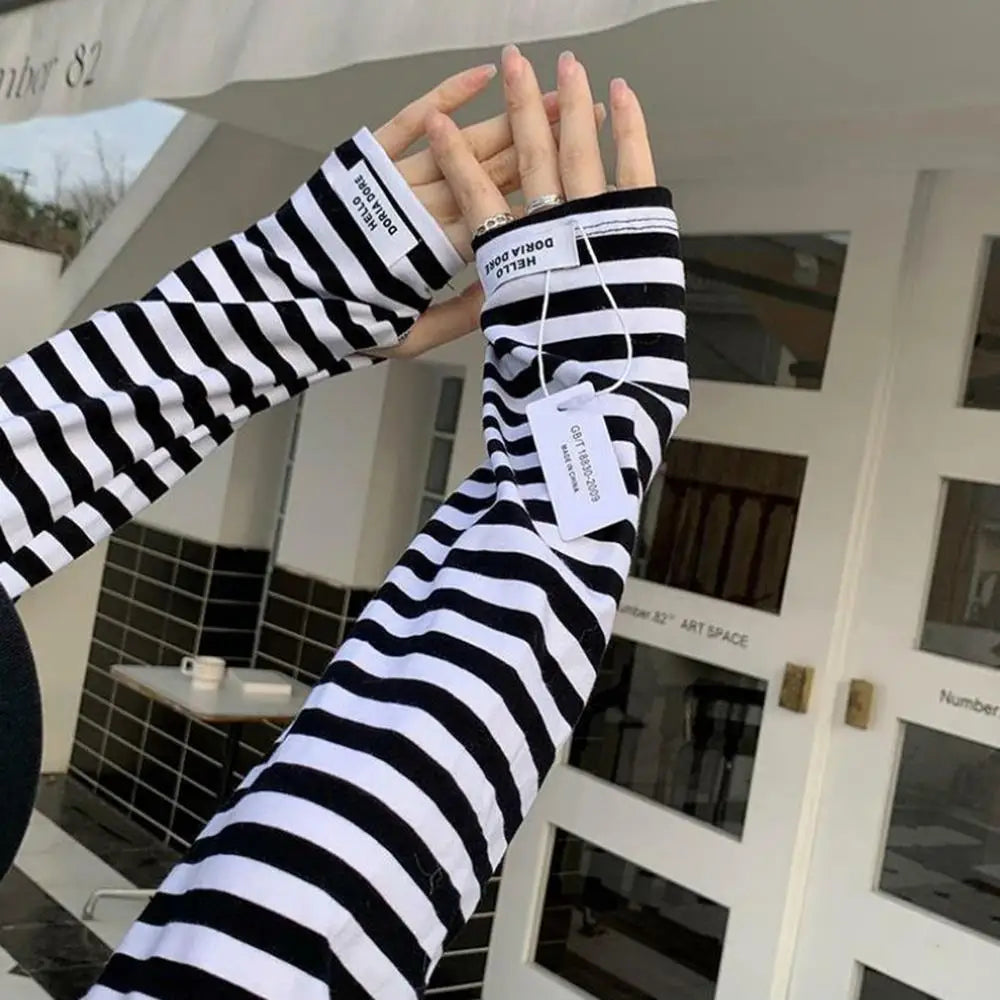 HOT Women Soft Cotton Stripe Loose Arm Protection Sunscreen Ice Silk Gloves Driving UV Protection Ice Sleeves Summer Cool Sleeve