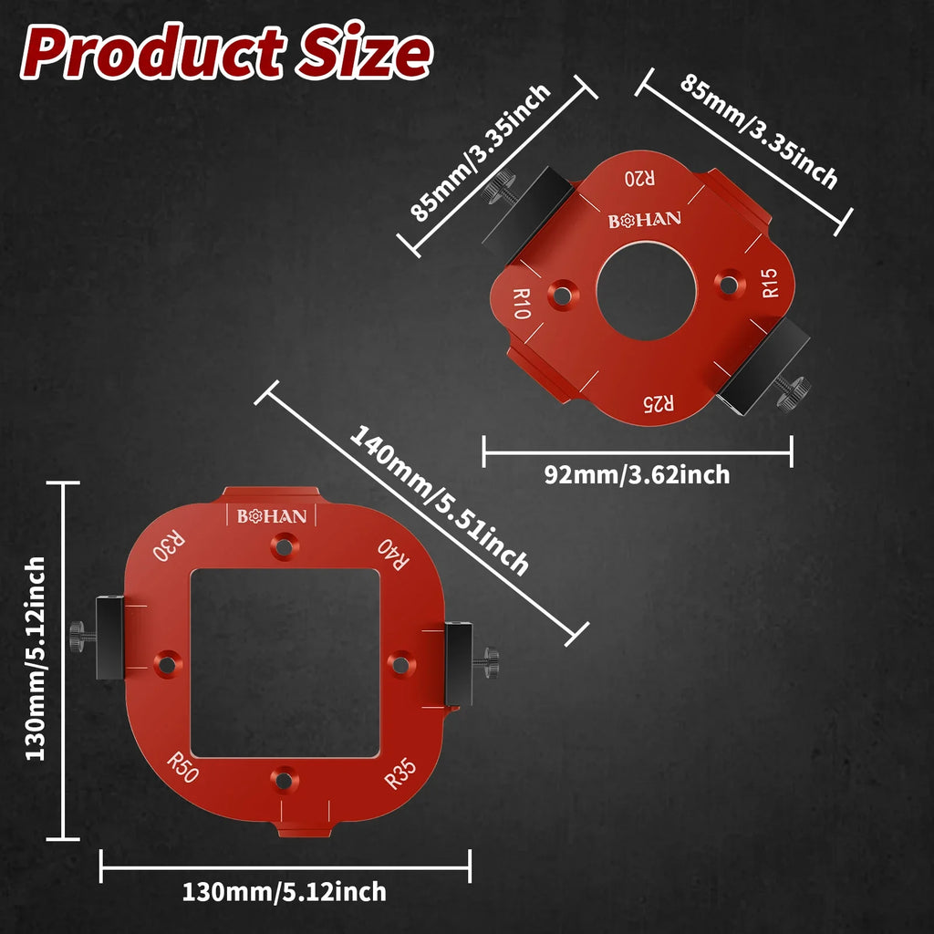Specifications: R10+R15+R20+R25 / R30+R35+R40+R50[Quick and Precise Cutting] Our template jig is designed to streamline your woodworking process, allowing you to achieve precise cuts quickly and easily. Note: The screws we give away are to better fix the product to ensure that there is no displacement during operating. If you don't want to leave traces of screws, you can also fix it without screws, but you need to pay attention to safety during use