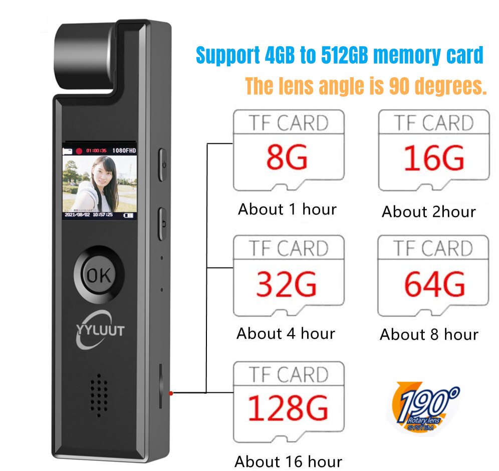 【190 degree Rotatable lens】This mini video recorder has a 190-degree rotatable lens , You can adjust the angle required for recording. When rotating the lens 180 degrees to take a selfie, you can rotate the upside-down video picture to normal.