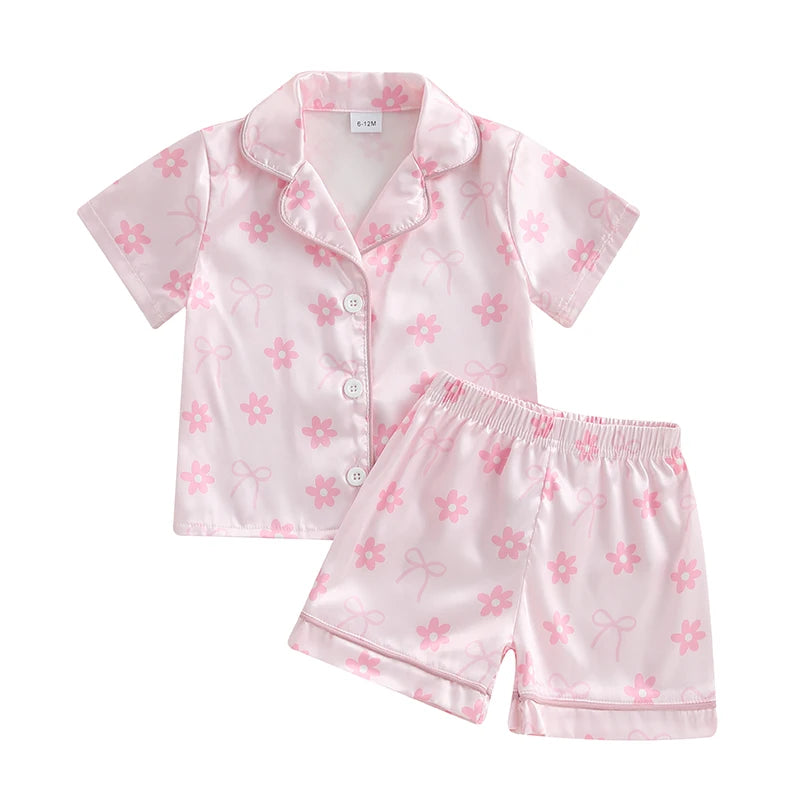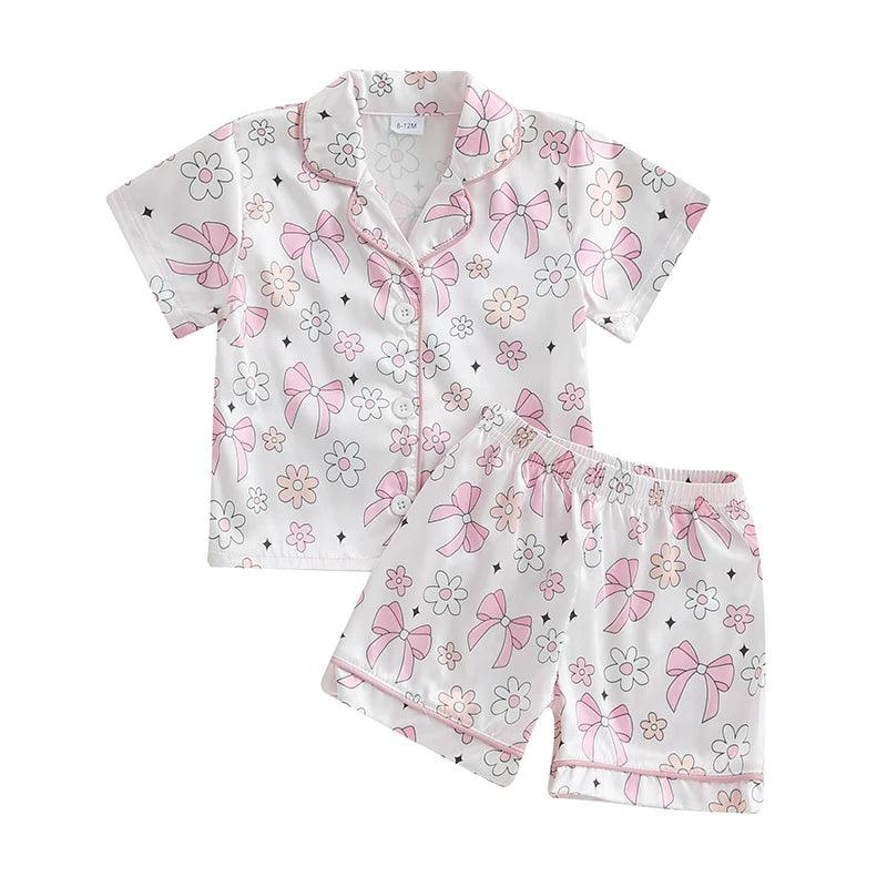 Toddler Girls Summer Pajamas Set Flower Bow Pattern Button Down V Neck Short Sleeve Tops and Shorts Lounge Wear 2 Pcs Set