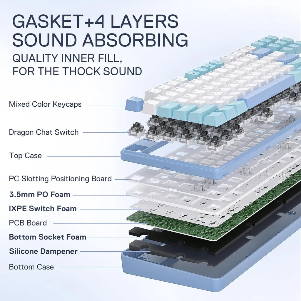 • Noise Dampening x 4 - Equipped with 3.5mm PO foam, IXPE switch foam, bottom socket foam, silicone bottom pad along with the silicone gasket. Significantly reduce the hollow noise, creating dampened and ultra-clean typing acoustics, making each keystroke satisfying and comfortable.