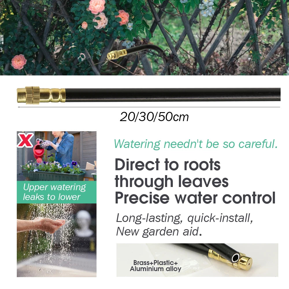 ✿  **Flexible Adjustment**: The nozzle, ranging from 20cm, allows for **360° twisting**, enabling flexible adjustment for concentrated directional spraying. It efficiently adjusts flow rate from left to right, and the **copper connector** ensures durability and long lifespan. Rotate the nozzle to adjust flow rate according to irrigation needs, showcasing high-quality craftsmanship and design upgrades.