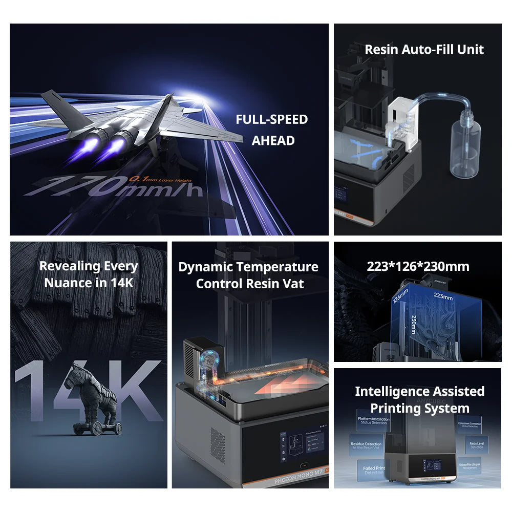 3.Do i need to buy high speed resin for the fast prints? Or this can print fast with the normal resin?Photon Mono M7 Pro can support both High Speed Resin and Standard Resins. The print speed is different. Max Speed 130mm/hr, 0.1mm Layer With Standand Resin; Max Speed170mm/hr, 0.1mm Layer With High Speed Resin.