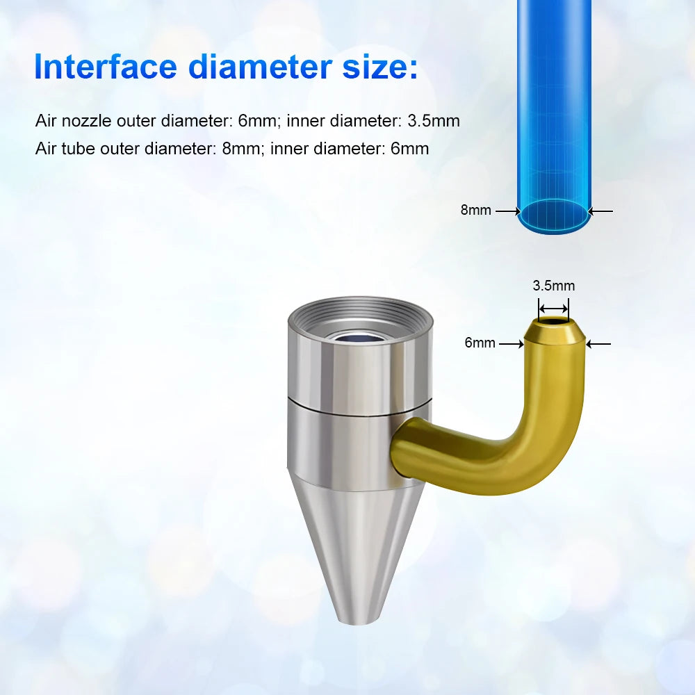 The laser head comes with a specially designed air assist nozzle. When cutting with this laser head, the air assit system will blow air through the air nozzle. That will bring you excellent cutting experience and greatly reduce burned marks.