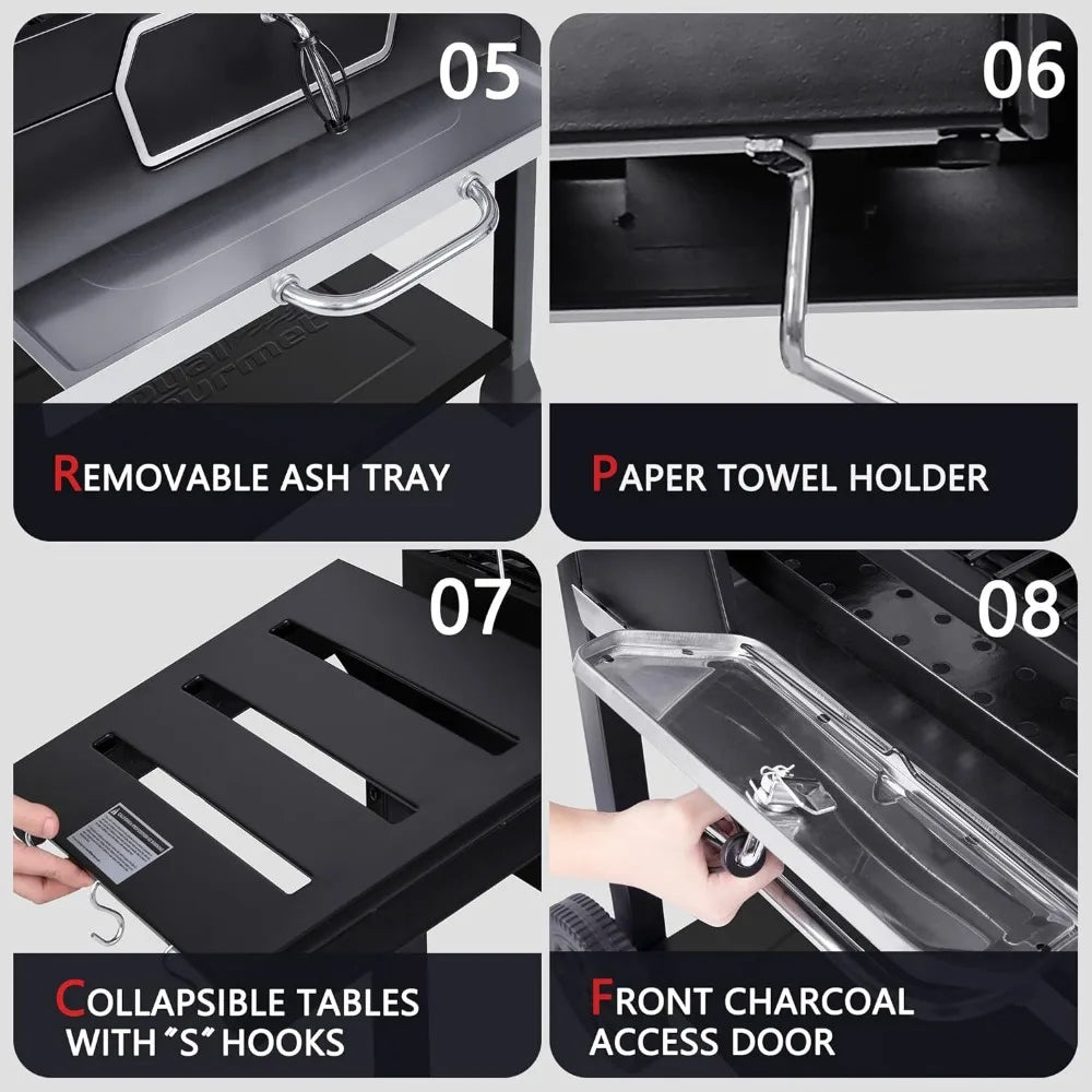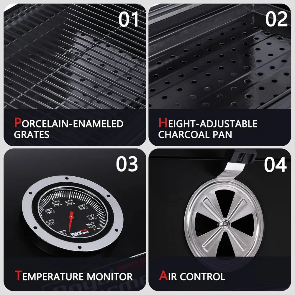 Spacious Cooking Space: 498 sq. in. porcelain-enameled steel wire cooking grates and 221 sq. in. chrome-plated steel wire warming rack give a total of 719 square inches cooking area. Extra large cooking surface caters for big parties or events.