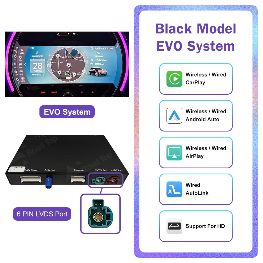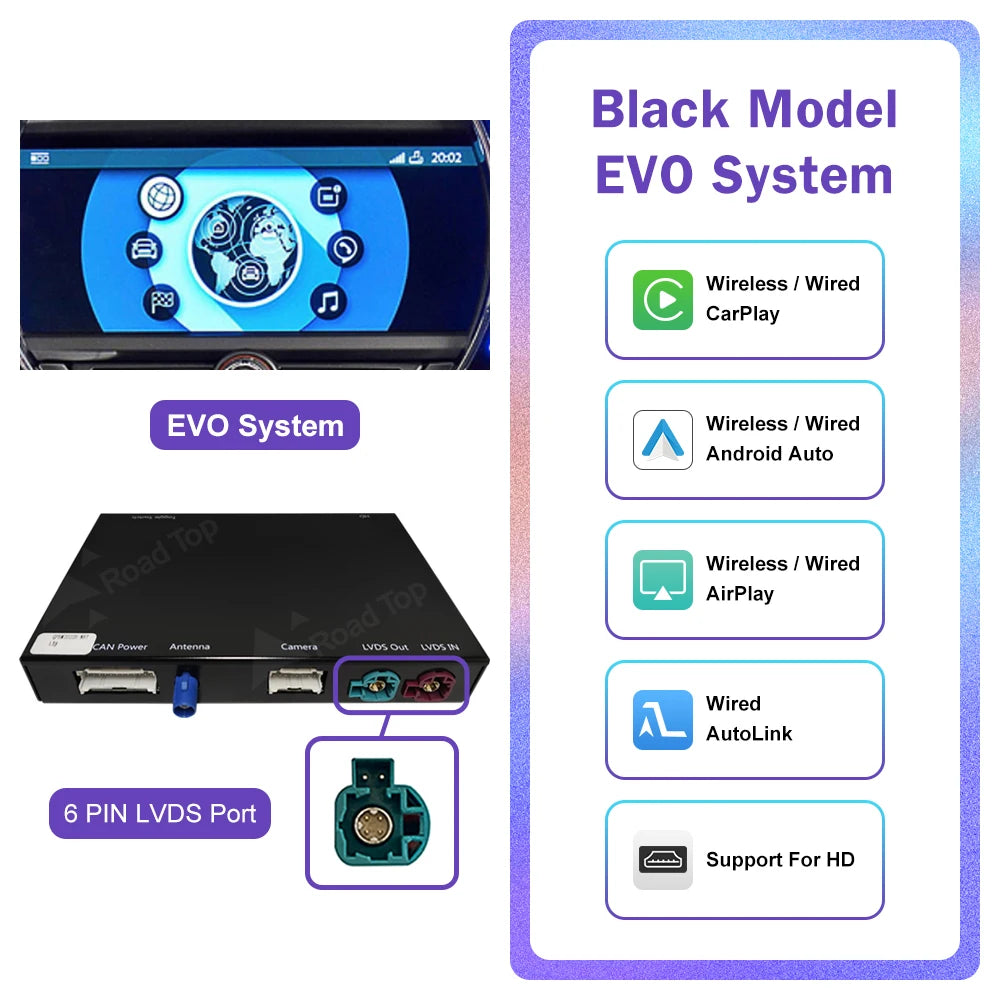 Please note: if you car is EVO system with 5 icon of the main menu and the screen size is 6.5inch, not touch screen,  this carplay box will not fit your car,  if your car is touch screen, this carplay box can fit. please note this before purchase, thank you!