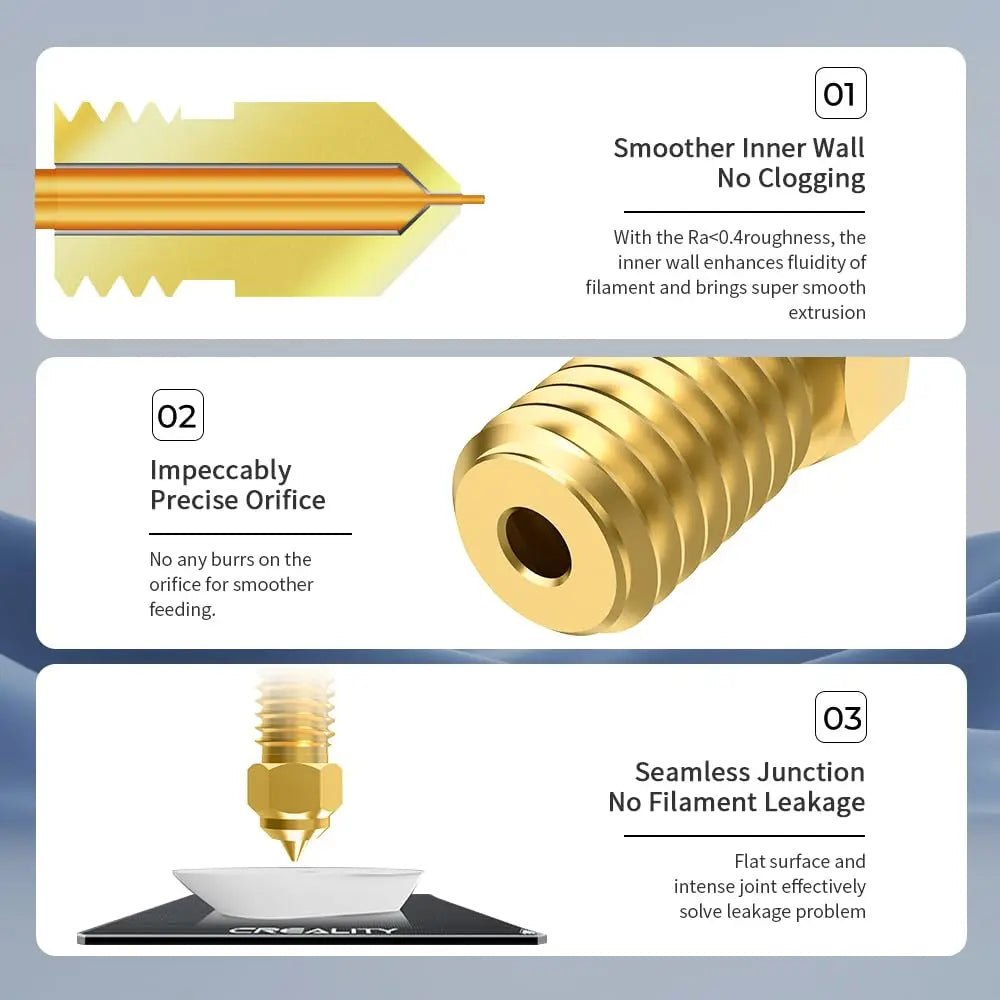 - 【High-Speed and Smoothness】The inner wall of Ender 7 nozzle is smooth, realizing smooth feeding and 0 clogging. The orifice is precise and burr-free, not easy to be clogged, and can be seamlessly connected with the machine without leakage.