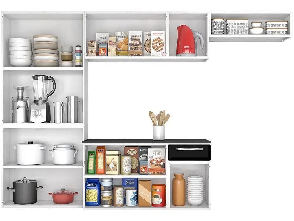 The Amanda Suspended Compact Kitchen from the Rose line of Itatiaia has a design that never goes out of fashion and with a lot of personality, Provides a cozy environment and with practical solutions for the day to day. Its structure is produced in 100% steel with coating in electrostatic powder paint of high gloss and resistant in the colors white and black, and the top in MDP coated in Formica. The furniture has 10 conventional doors with opening in metal hinges, with metallic handles, easy to handle and resistant. In addition, it has 1 drawer with telescopic slide opening and 8 shelves well distributed to fit all utensils and groceries. It also has 1 niche to decorate and organize everything with great taste. With this compact kitchen you will have a classic environment and always organized with great beauty!