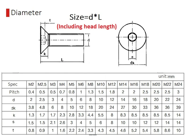 M5 304 Stainless Steel Hexagon Socket Countersunk Head Screws M5*6 8 10 12 14 16 30 40 50 60 70 80 90 100mm DIN7991 Full Thread