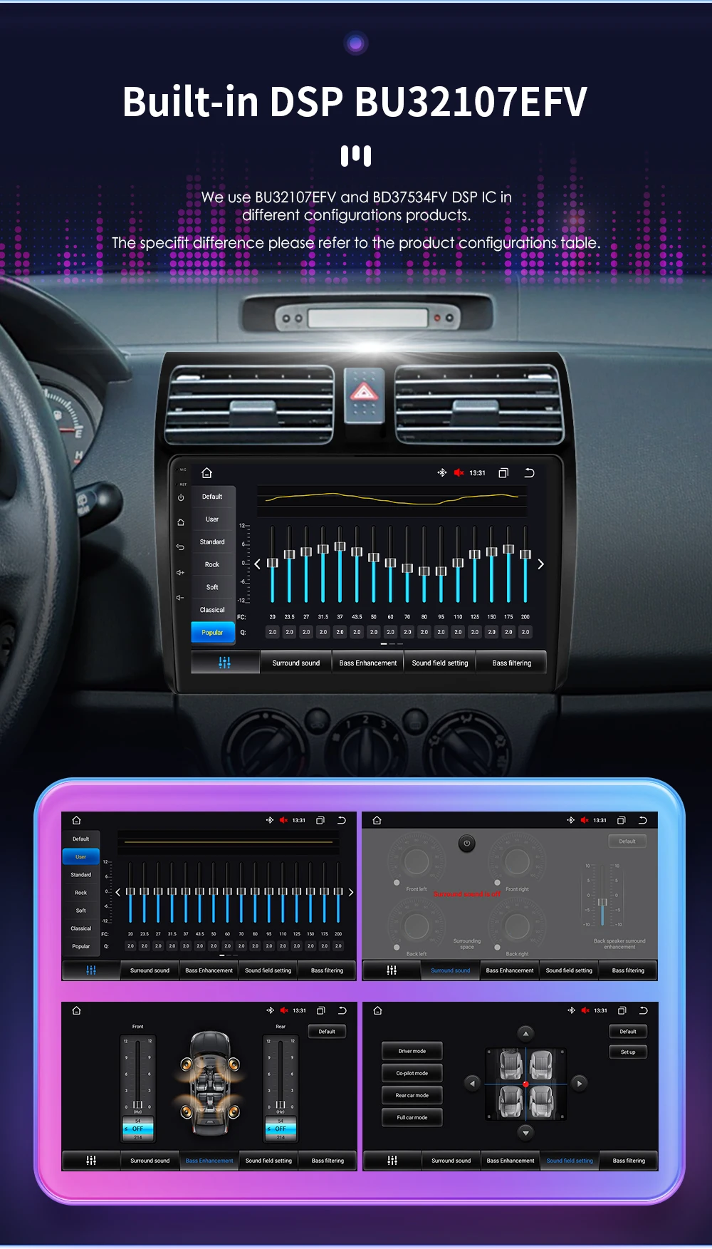 Built-in DSP BU32107EFV: We use BU32107EFV and BD37534FV DSP IC in different configurations products. The specifit difference please refer to the product configurations table.