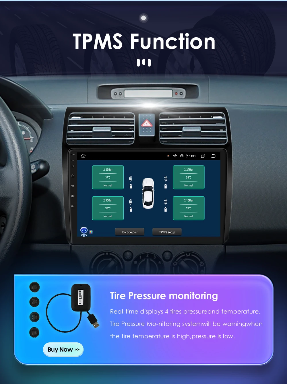 TPMS Function( Needs to order separately) :  Tire Pressure Monitoring: Real-time displays 4 tires pressure and temperature,Tire Pressure Monitoring system will be warning when the tire temperature is high, pressure is low.