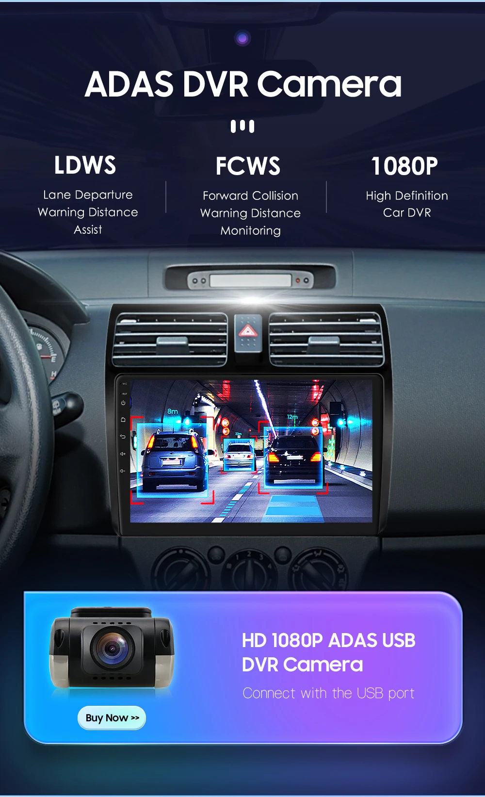 HD 1080P ADAS DVR Camera(Needs to order separately) --connect with the USB port:  LDWS(Lane Departure Warning Distance),FCWS(Forward Collision Warning Distance), 1080P(High Definition Car DVR).