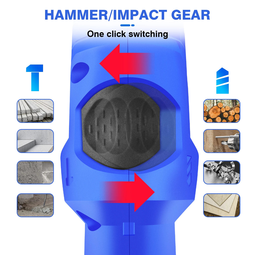 【 Hammer & Impact 2 In 1 Drill】By turning on or off a hammer drill's impact mechanism according to your task, it not only possess a drilling feature, but also works as an impact drill that provides a rapid succession of short hammer thrusts to break through concrete, stone, wood and metal with less effort.