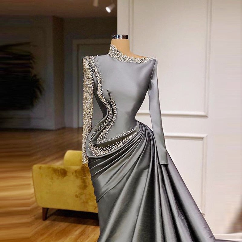 SauDi Arabic Long Sleeves Evening Dresses Major eading Pearsl Sequins Satin Prom Dress vestidos de fiesta Formal Party Gowns