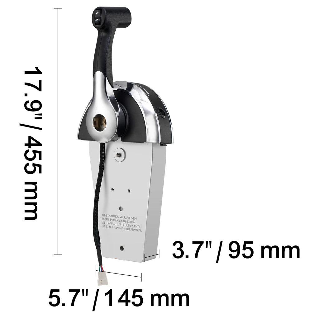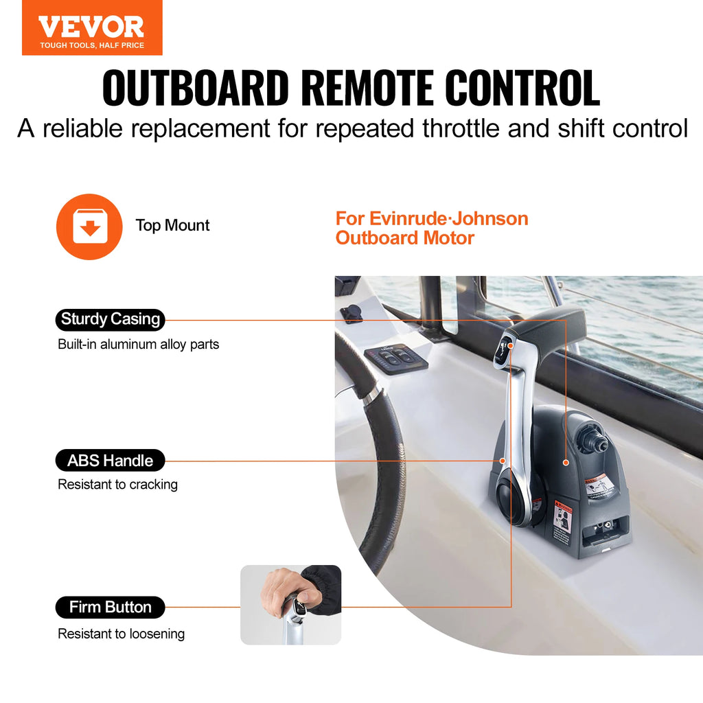 Durable and Reliable Build: Crafted from aluminum ADC2+ASA and featuring an ABS shell handle, this top-mounted outboard remote control kit is designed for durability. The robust materials and plastic button ensure firm, reliable operation, even during frequent push-pull maneuvers. Long Control Cable for Flexibility: Equipped with two cable harness options – a 2.1 ft/640 mm 6-pin connector and a 2.4 ft/740 mm 3-pin connector – this control box provides ample reach for installation. Always remember to turn off the ignition, remove the key, and disconnect cables before measuring cable lengths. Emergency Stop Lanyard for Safety: This throttle control box features a built-in emergency stop switch with a lanyard. It automatically halts the engine if the driver is displaced, enhancing safety. The lanyard can be attached securely to the driver's wrist or waistband. Smooth Gear Shifting Control: For precise gear shifting, press the neutral release button to engage gear, then push the control lever forward for forward gear and backward for reverse, both by approximately 35°. The friction adjustment knob allows fine-tuned control of speed and thrust. Trim and Tilt Adjustment for Flexibility: The power trim and tilt switch on the control lever handle lets you easily adjust the position of the stern engine. Use the ""↑"" button to tilt upward and ""↓"" to tilt downward, optimizing engine performance during loading/unloading and minimizing engine submersion.