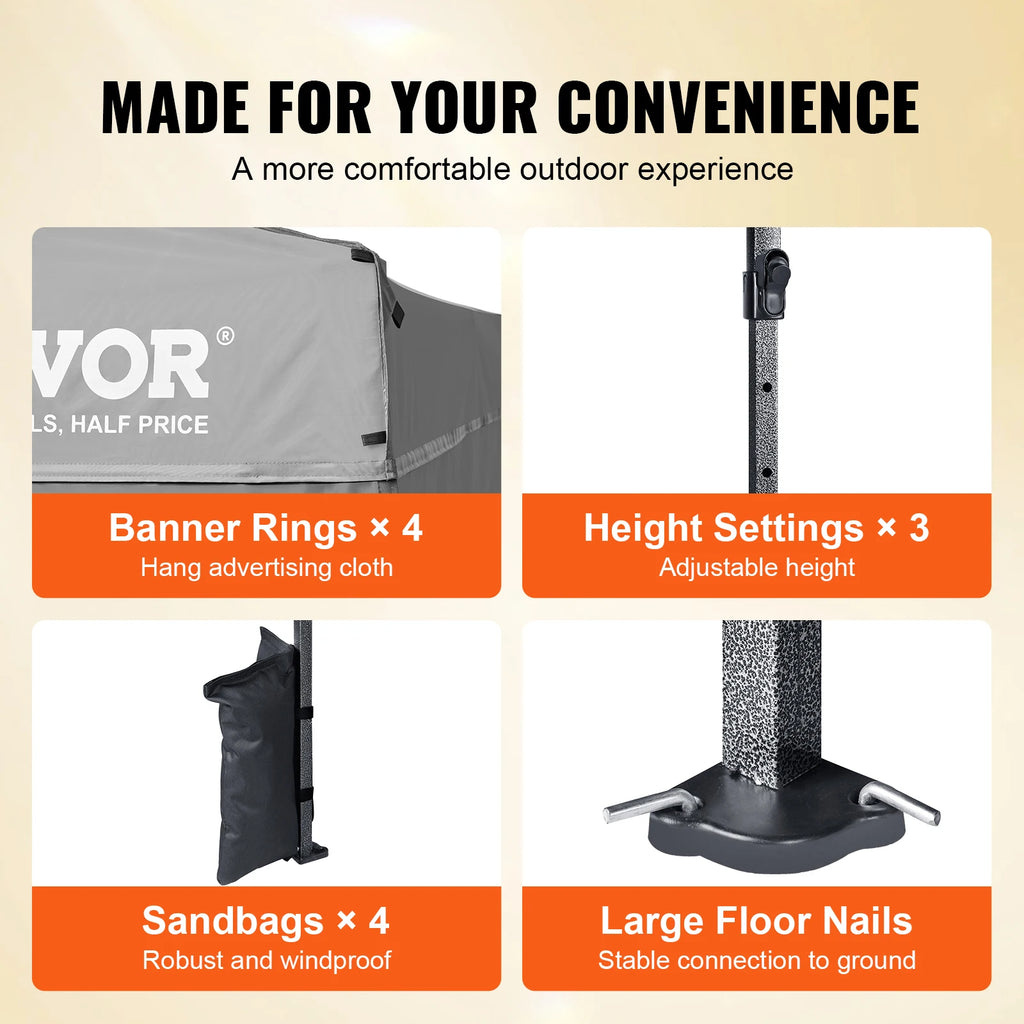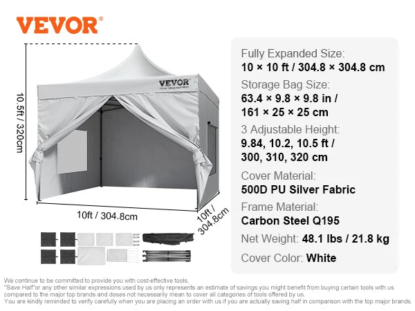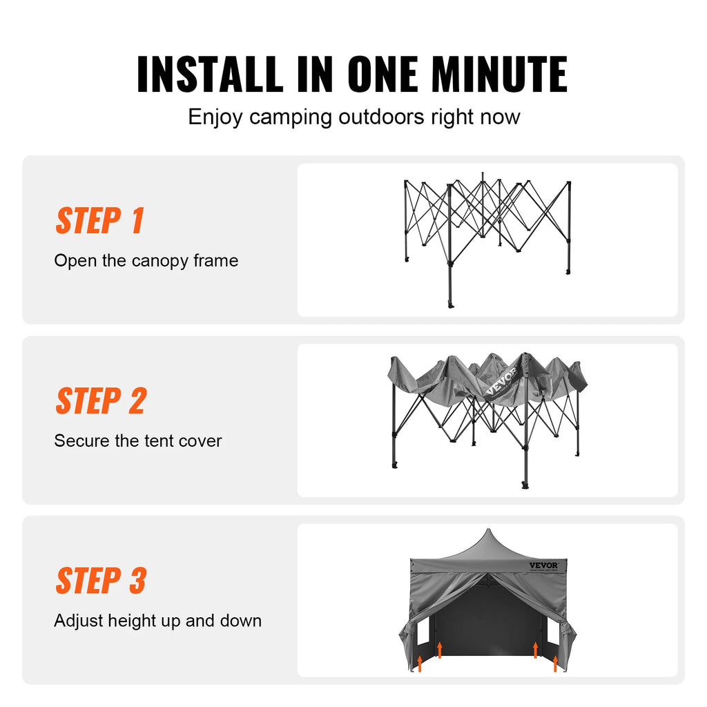 Extra Large Pop up Canopy: This 10x10 pop up canopy tent can be assembled in one minute, providing a temporary gathering place of 100 square feet. With three adjustable heights and a maximum internal height of over 9 ft, it offers a spacious standing room. This canopy with sidewalls comfortably accommodates 6-8 people, providing sun shade for a comfortable gathering.