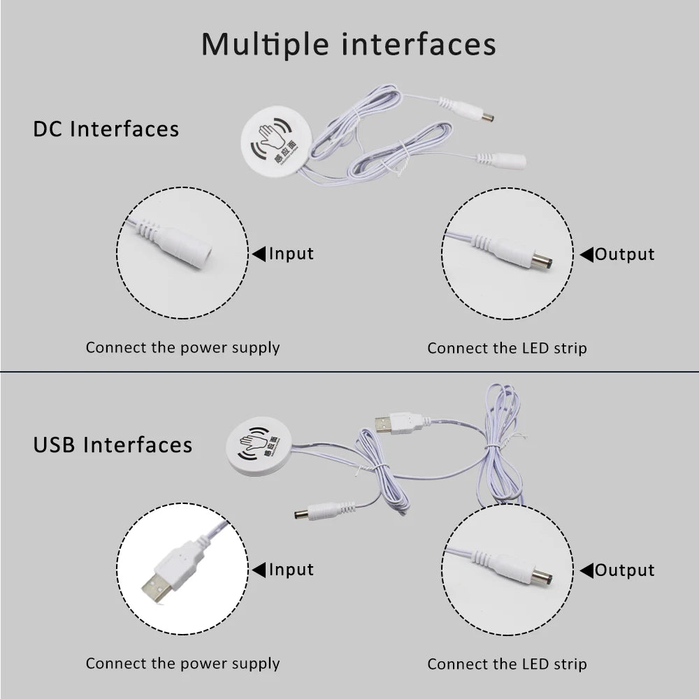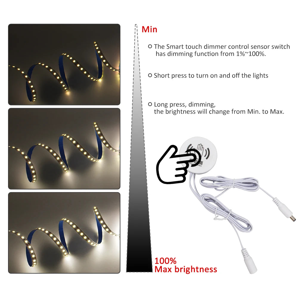 1.The Smart touch dimmer control sensor switch is used behind wood board (like kitchen cabinet ,wardrobe, closet..) or glass mirror. It can work on dc 12V led light, And it more flexible to stick anywhere you like,simple and easy to instation. DON'T NEED OPEN HOLE!!!