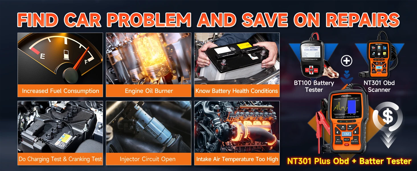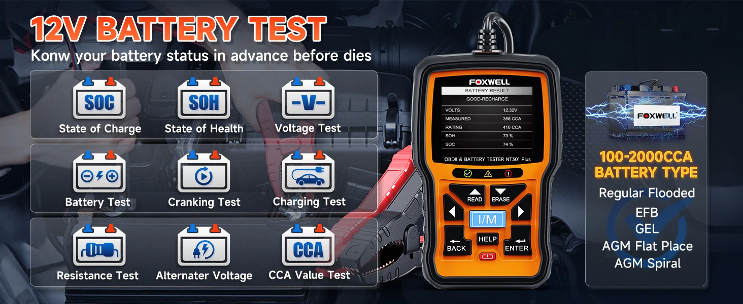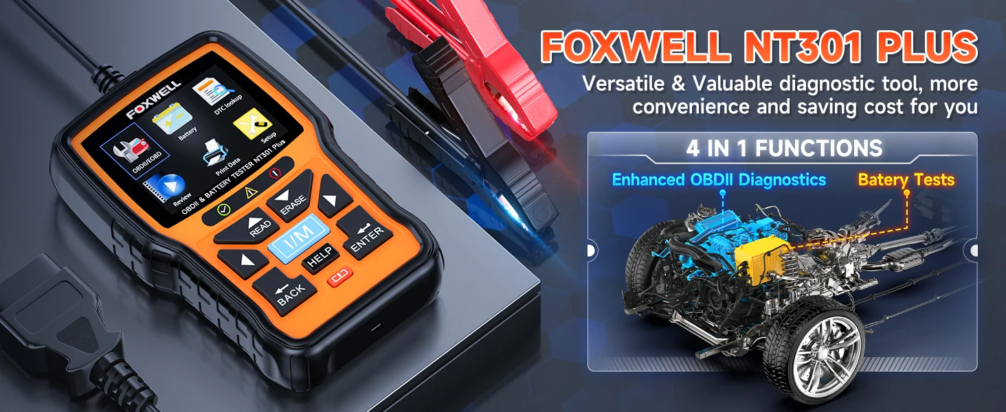 FOXWELL NT301 Plus 2 in 1 OBD2 Scanner Battery Tester OBDII Diagnostic Tool Check Engine Car Code Reader 12V 100-1100CCA Crank