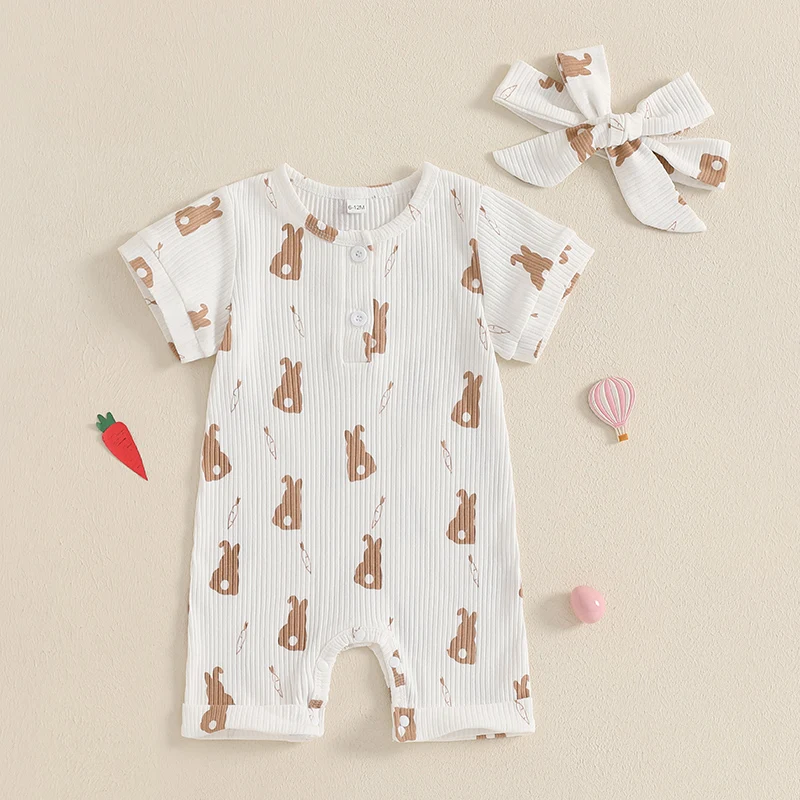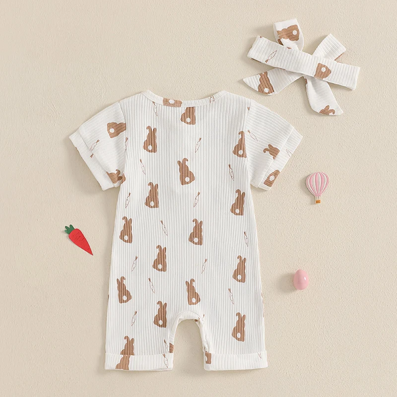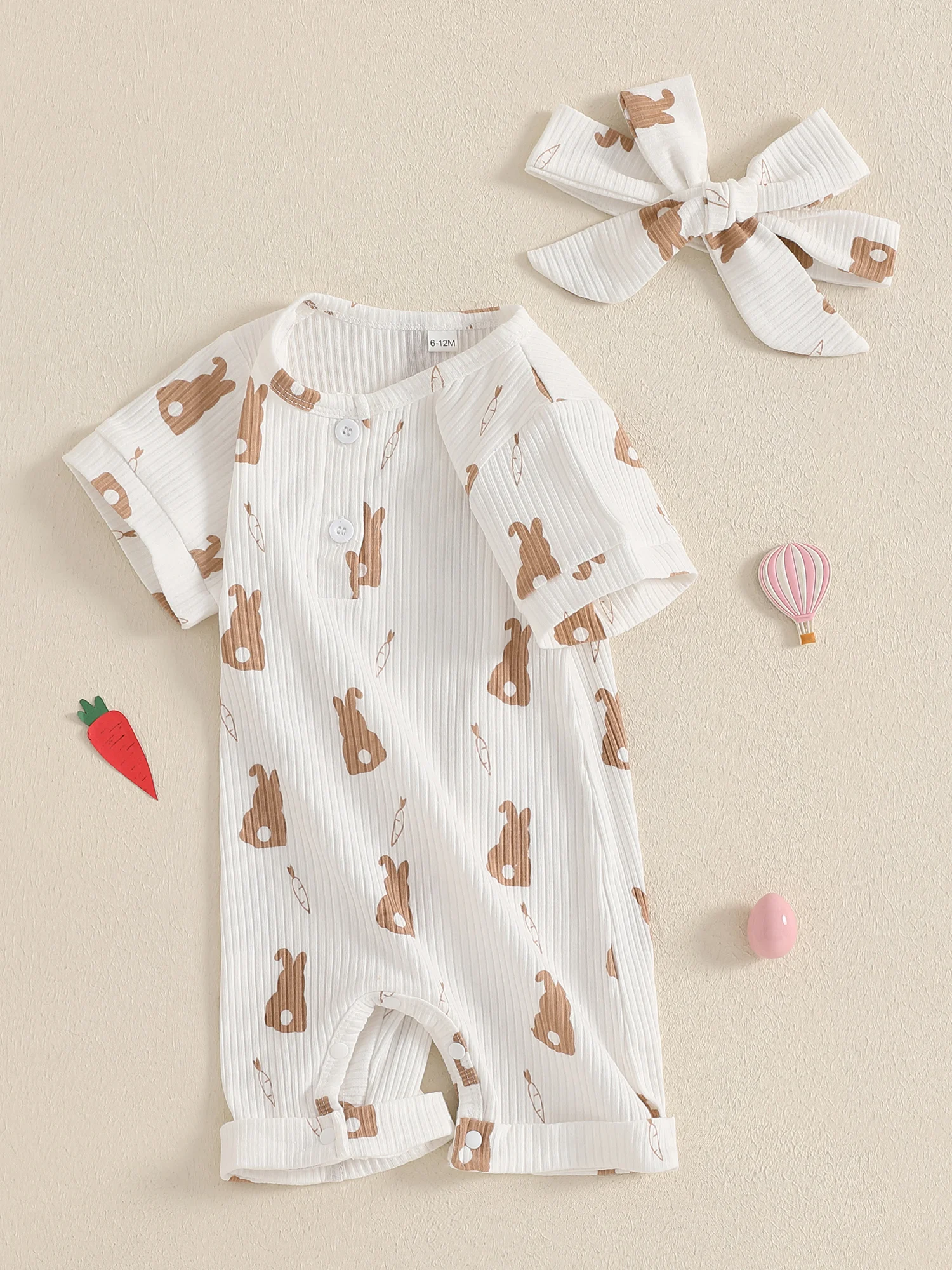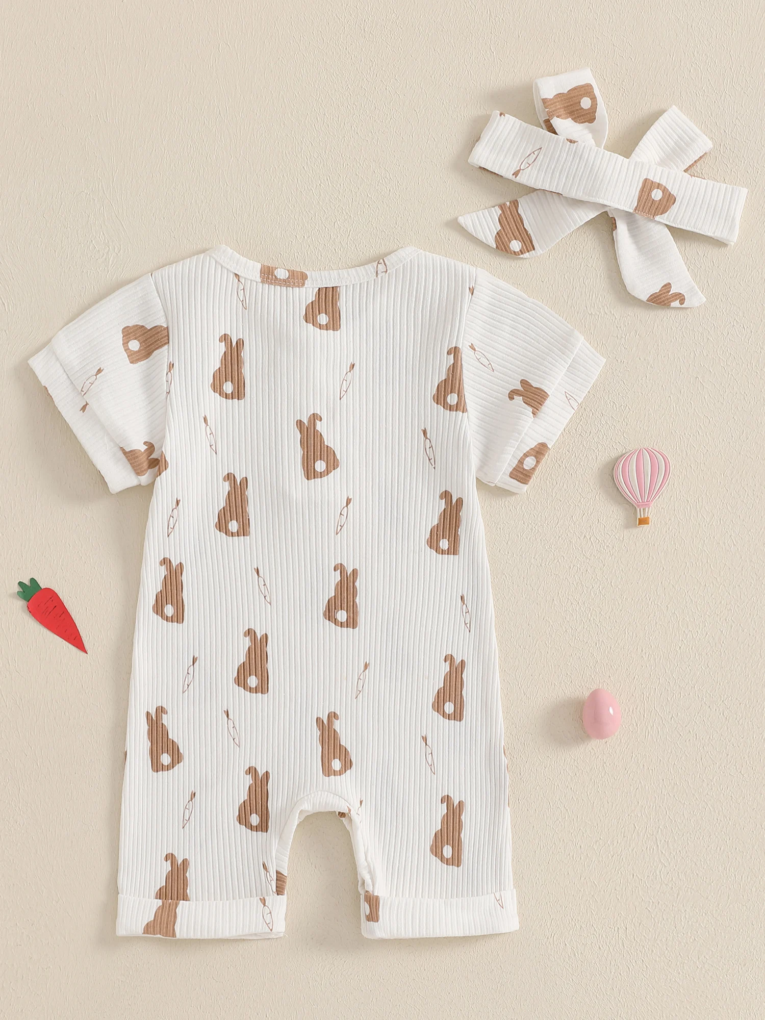 Baby Girl Easter Casual Jumpsuit Short Sleeve Bunny Carrot Print Romper with Headband