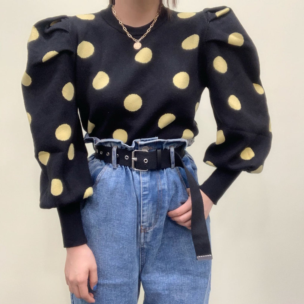 Korean Puff Sleeve Women Pullover Knitwear 2020 Spring Autumn Polka Dot Winter Top Knitted O-Neck Sweater Bottom Jumper