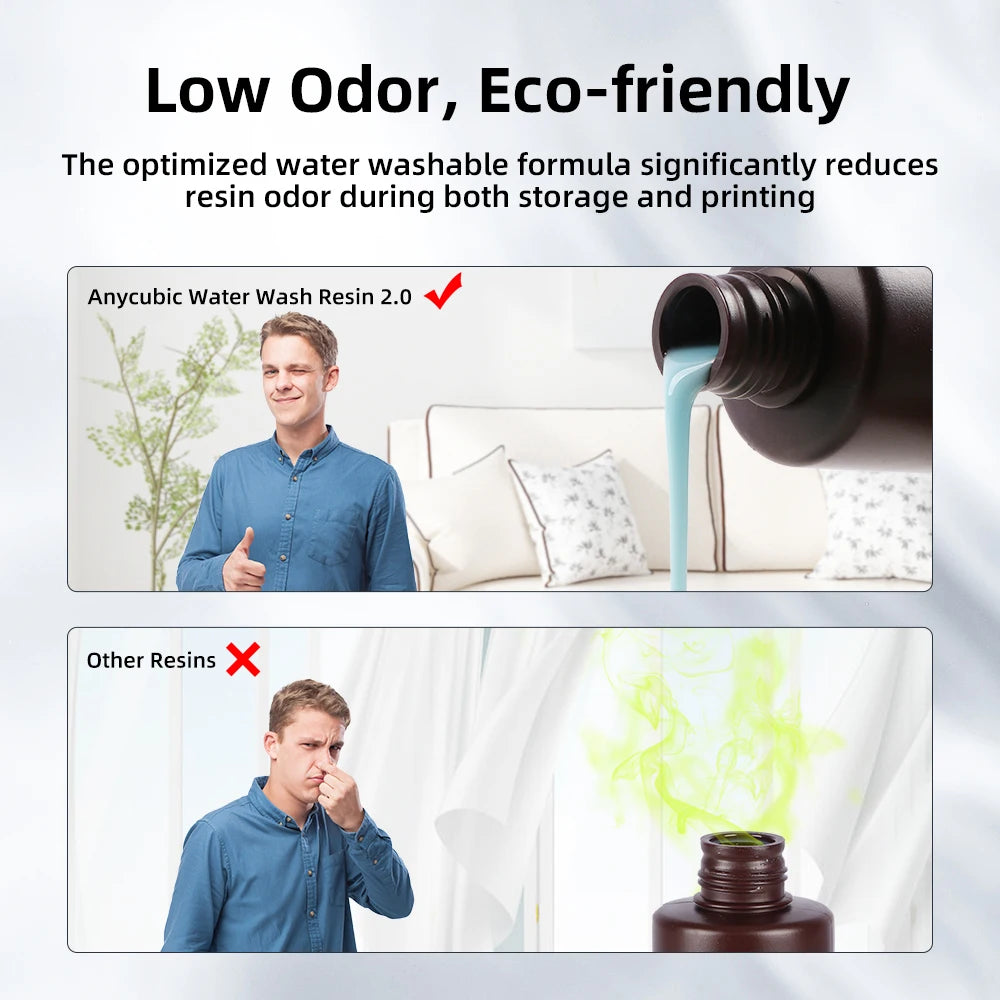The optimized water washable formula significantly reduces resin odor during both storage and printing, greatly enhancing the user experience. This improvement not only makes the process more environmentally friendly but also ensures a more comfortable and pleasant printing experience.