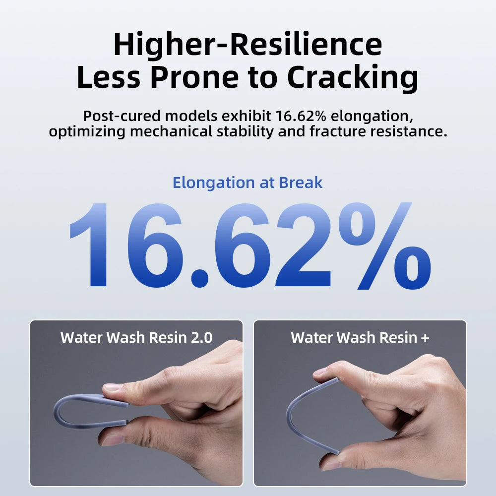 With an impressive elongation rate of 16.62%, the model achieves exceptional toughness post-curing, enhancing its durability, strength, and resistance to cracking.