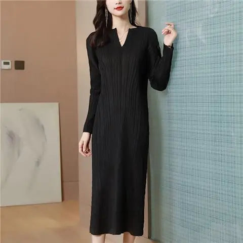 Pleated Dress Women's Long Sleeve Spring and Autumn 2023 New V-Neck Bottom Skirt Slim Fit Long Dress