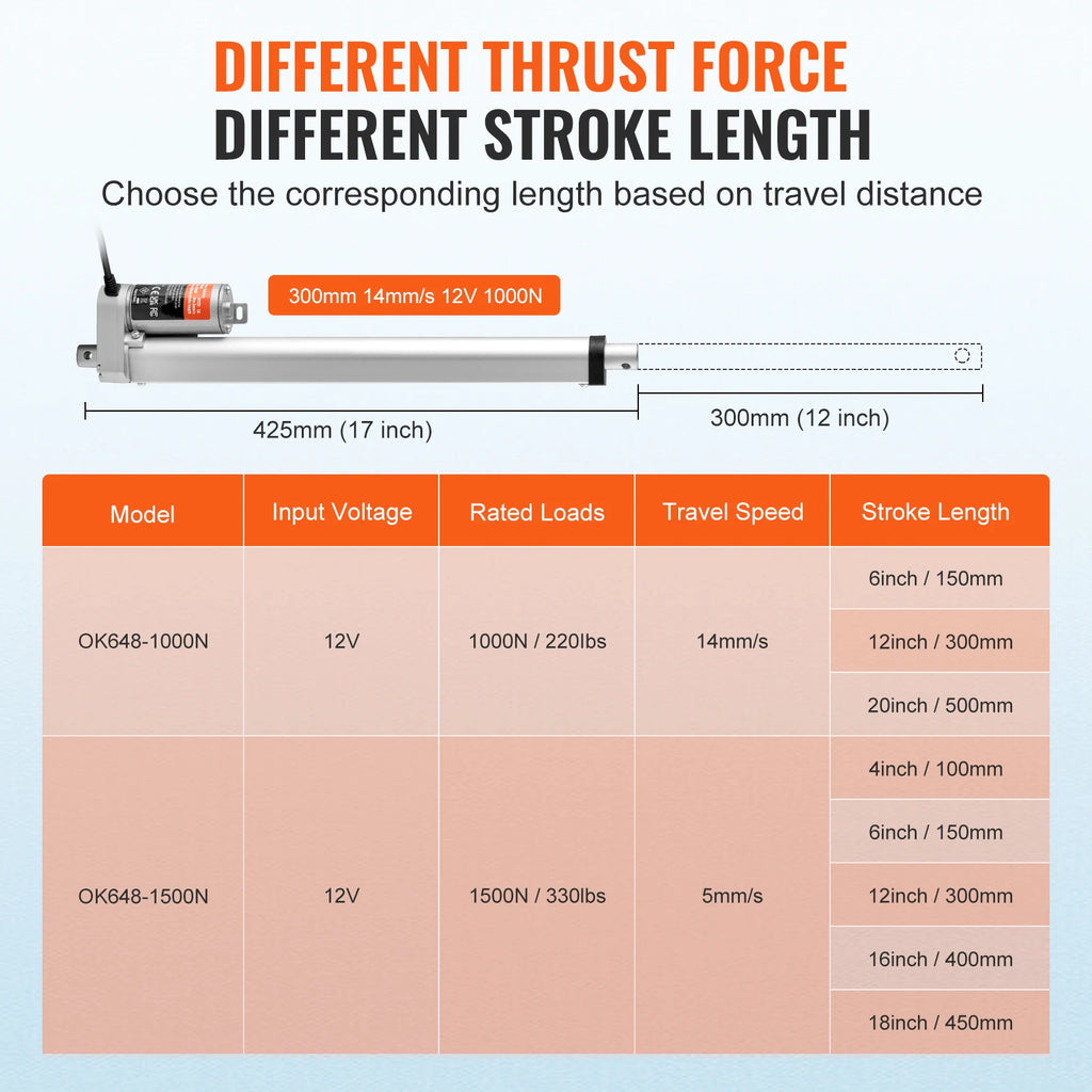 Experience 0.55"/s high-speed movement and 220lbs strong actuation force with VEVOR 12-inch linear actuator! Powered by robust motor and offering precise rotation, it delivers strong support and high-efficiency motion for furniture adjustment, automation systems, mechanical equipment, and more.