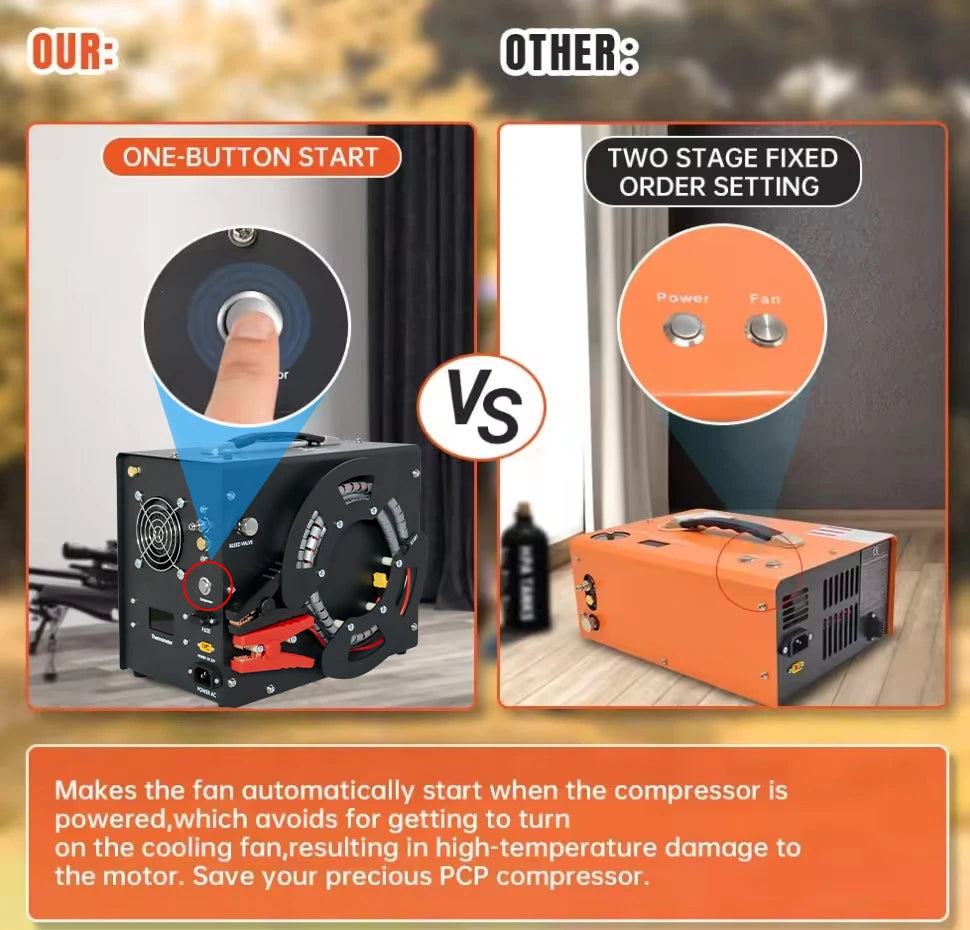 【Built-in Adapter & Fan】: This PCP airgun compressor is cooled by a built-in fan, no need for external water or oil, and the power converter is also built-in, easy to operate. The cooling fan is controlled manually; please shut off the compressor and keep the cooling fun running when the temperature reaches 70 ℃.