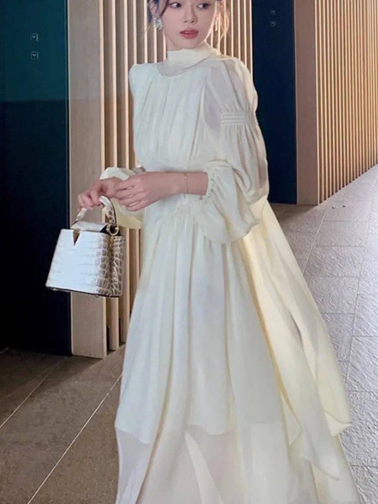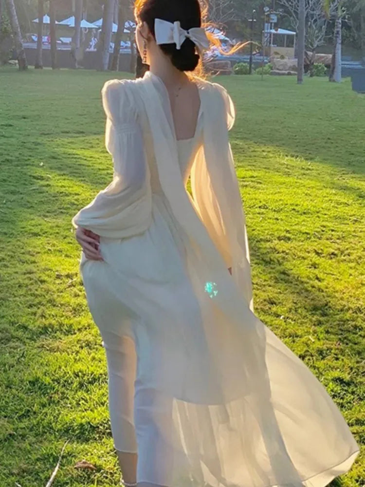Women French White Chiffon Dresses Summer Elegant Sleeve Slim Puff Sleeve bodycon Gentle Fairy Short Dress