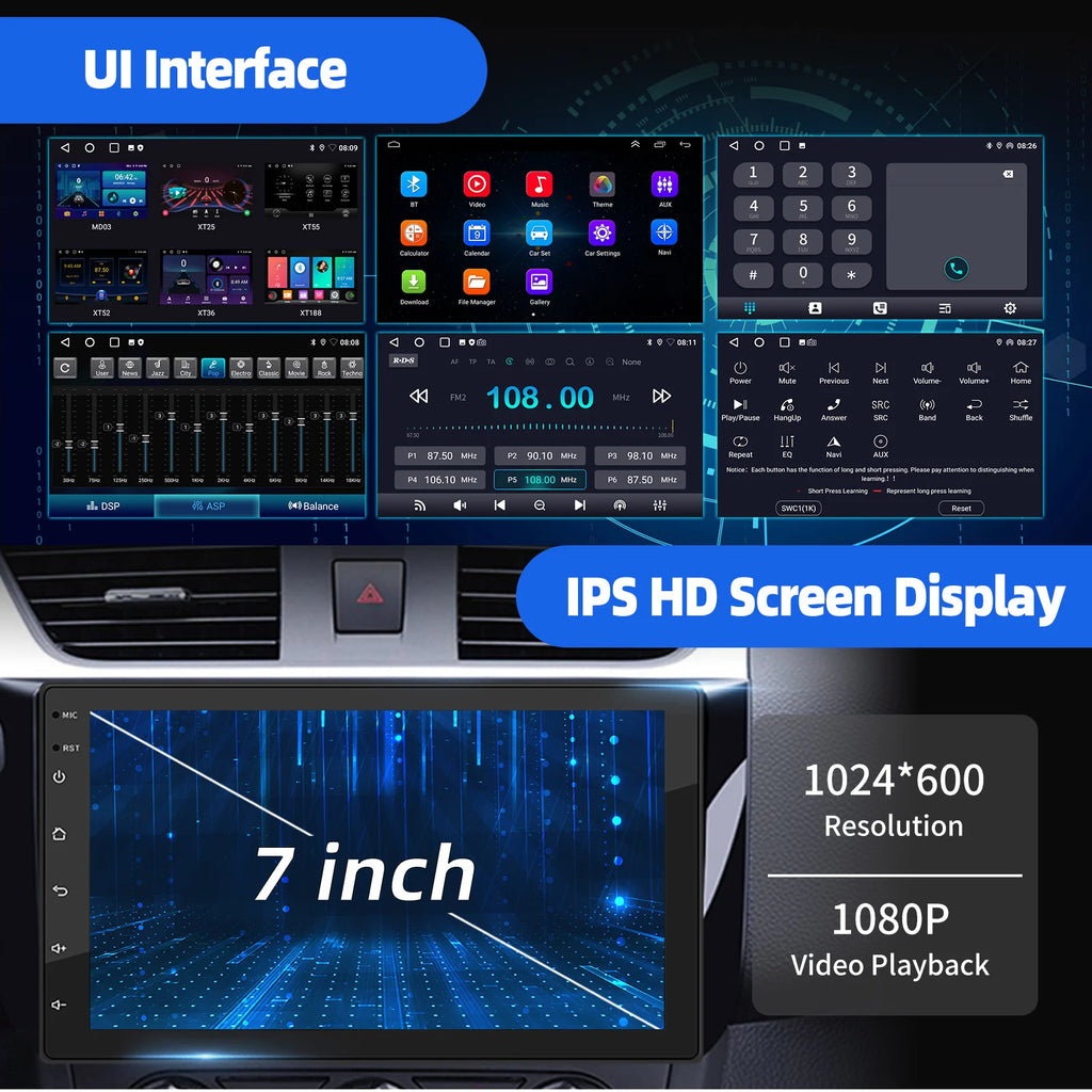 7 Inch 2 DIN Android Car Radio: The Android car radio with 7 inch IPS capacitive touch screen, 4GB RAM and 64GB ROM provides enough space to download your favourite apps and videos, so driving won't be boring anymore. With two USB ports, it supports fast mobile phone charging. With the rear microphone input, you can add a microphone to make your voice clearer (MIC is optional).