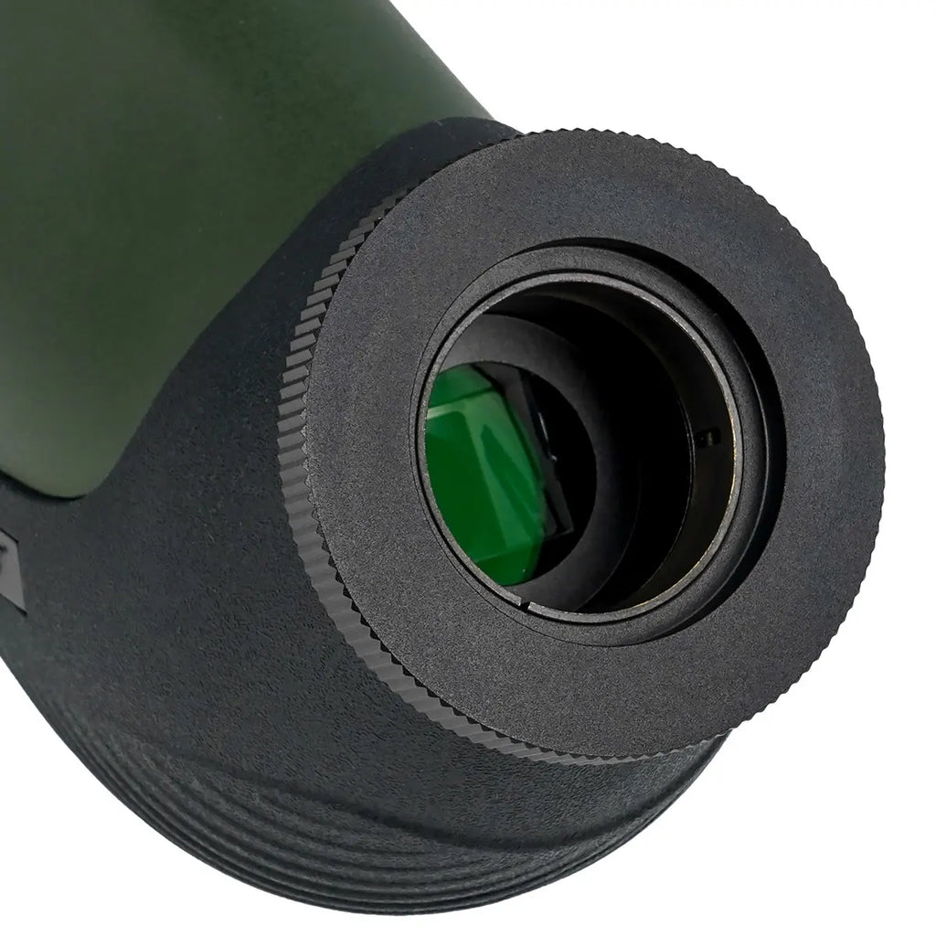 Adjustable eyecups can be twisted up and down for comfortable viewing with or without eyeglasses. The built-in sunshade reduces glare and shields the objective lens from raindrops and snow.