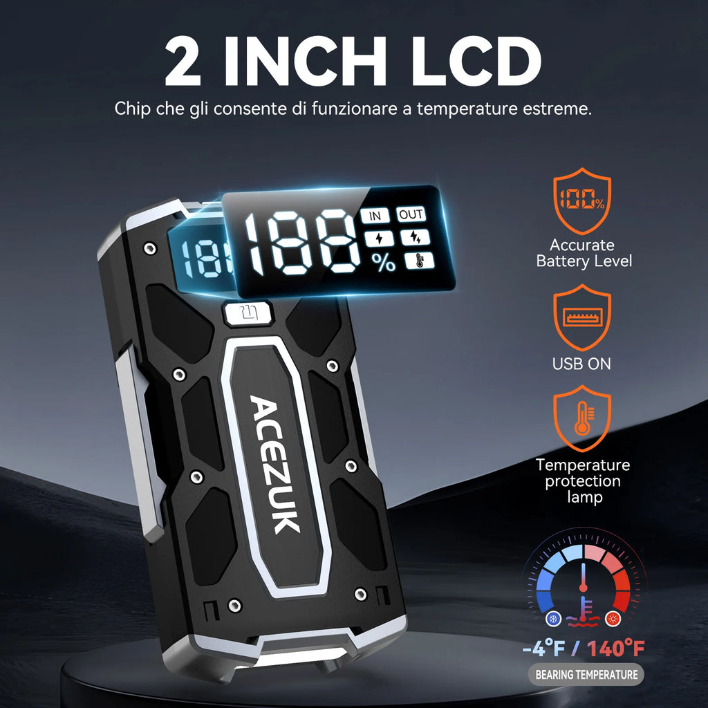 ACEZUK is one of the most powerful boosters, specially developed for vehicles with high displacement (up to 8.0 L petrol or 6.5 L diesel). It can start any car with a 12V battery in seconds. Can be used up to 50 times on a single charge! Suitable for cars, trucks, motorcycles, water scooters, lawnmowers, yachts, pick-ups, snowmobiles, etc. Ideal for emergency repairs.
