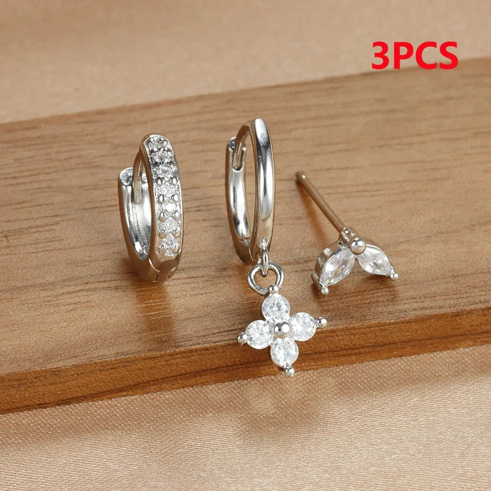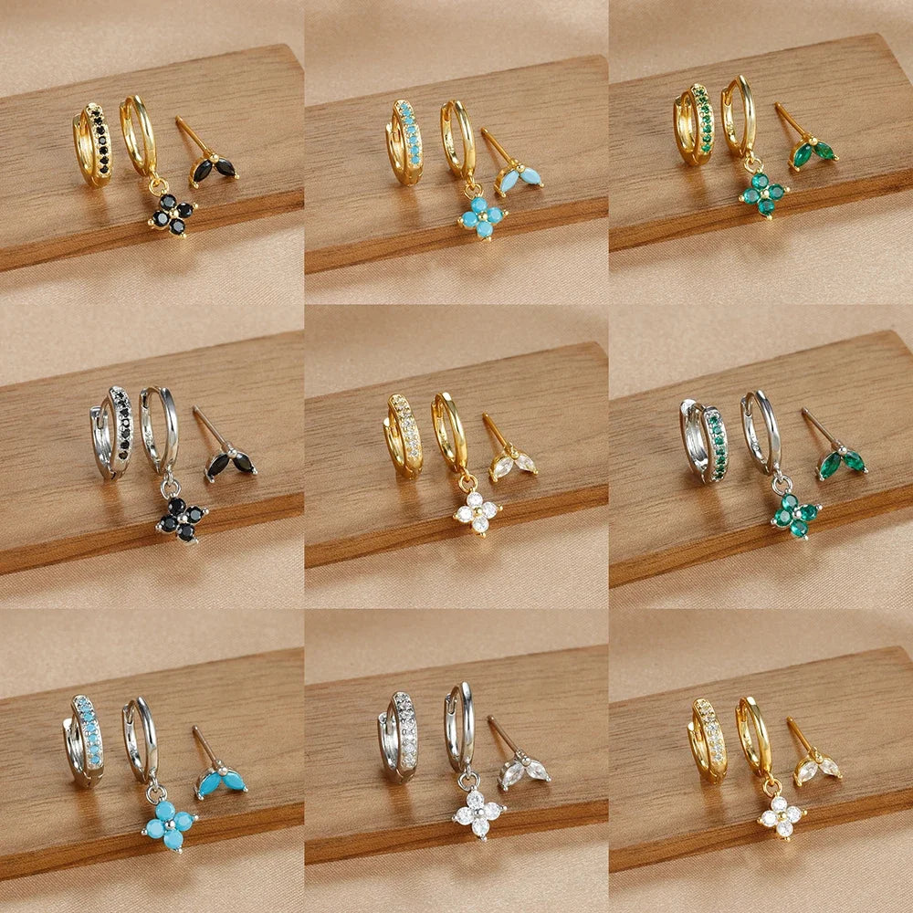3PCS Stainless Steel Gold Color Four Flower Hoop Earrings Set for Women Elegant Zircon Pendant Huggies Piercing Trendy Jewelry