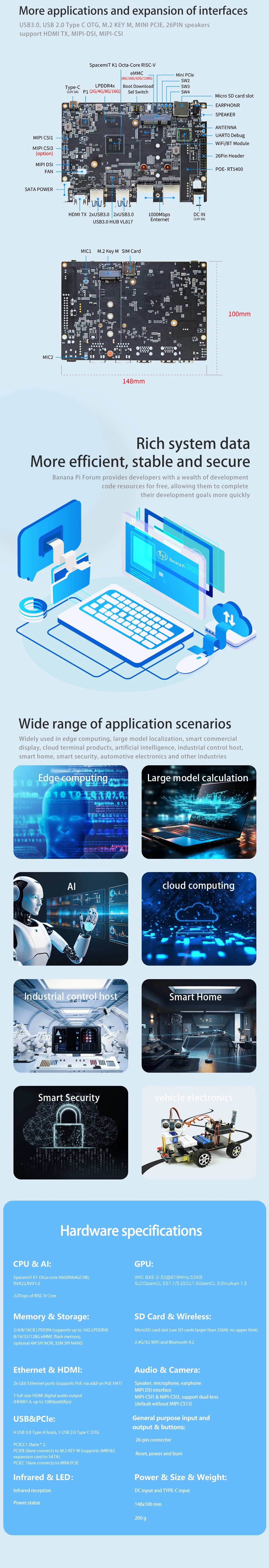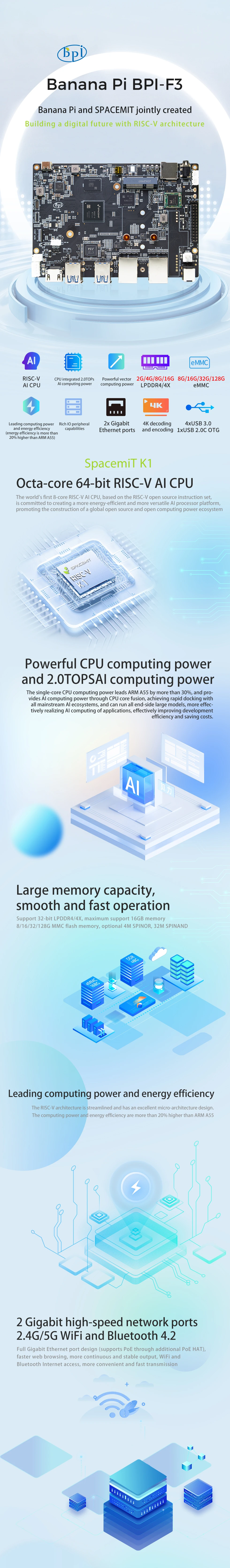 Banana Pi BPI-F3 SpacemiT K1 8 Core RISC-V chip 4G LPDDR4 16G eMMC 2.0TOPs AI computing power Industrial Grade Development Board