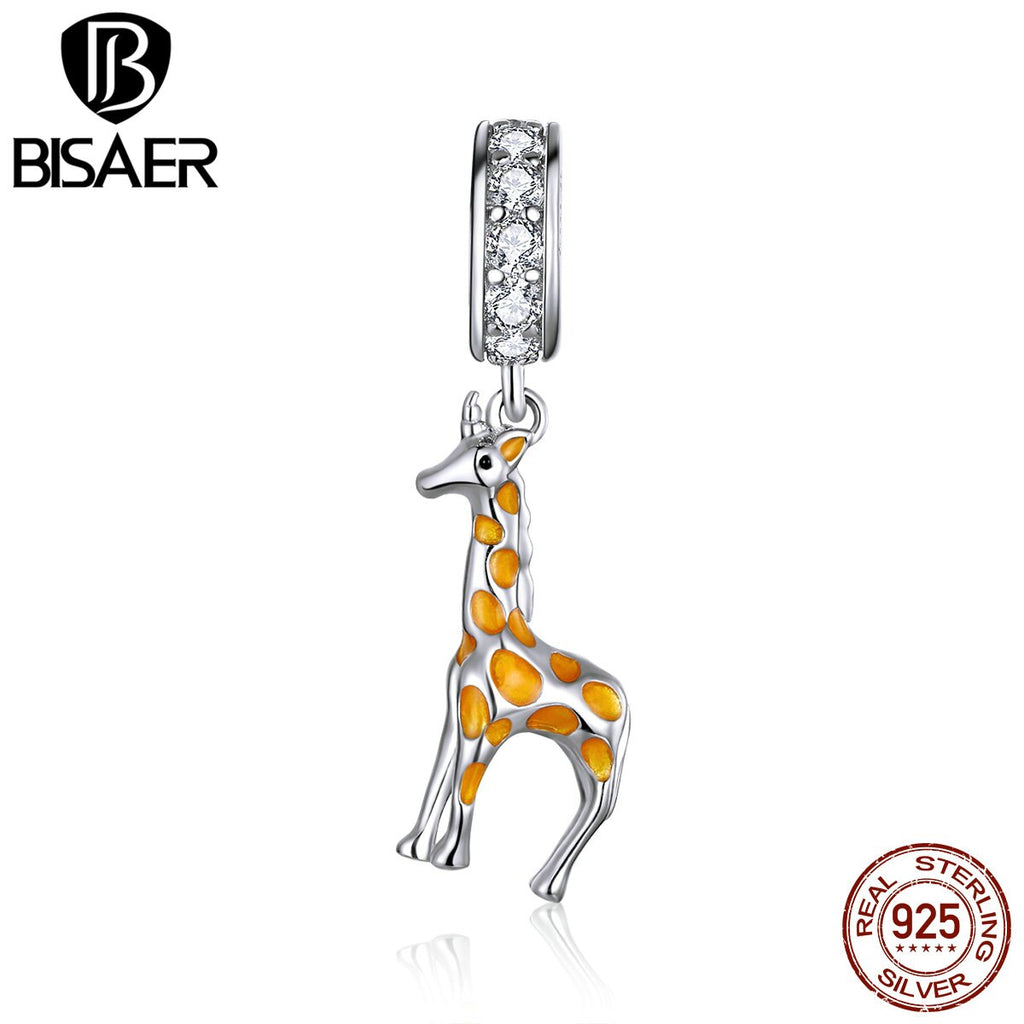 BISAER Animal Giraffe Dangle Charm 925 Sterling Silver Enamel CZ Beads Pendant DIY Original Bracelets Necklace Jewelry EFC258