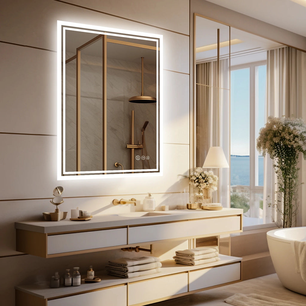 Rectangle Wall Hanging Led Backlit Light Up Bathroom Mirror for Makeup Shaving with Touch Switches 3 Lights Defog