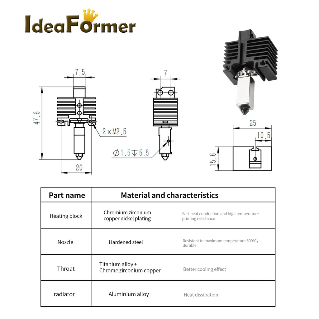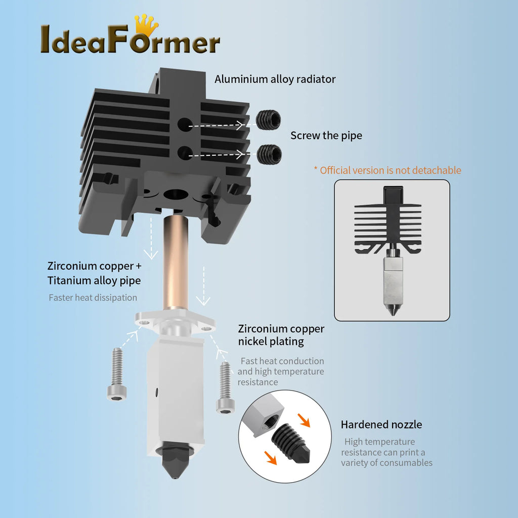 3. The heating block is treated with chromium zirconium copper nickel plating, which has fast thermal conductivity and high temperature printing resistance. The titanium alloy throat is wrapped with chromium zirconium copper for better heat dissipation.