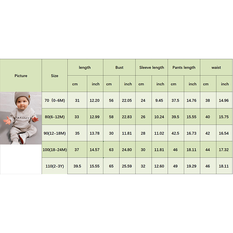 70 Tops Length: 12.20 Bust: 22.05 Pant Length: 14.76 Waist: 14.96 Advised Age: 0-6 Months