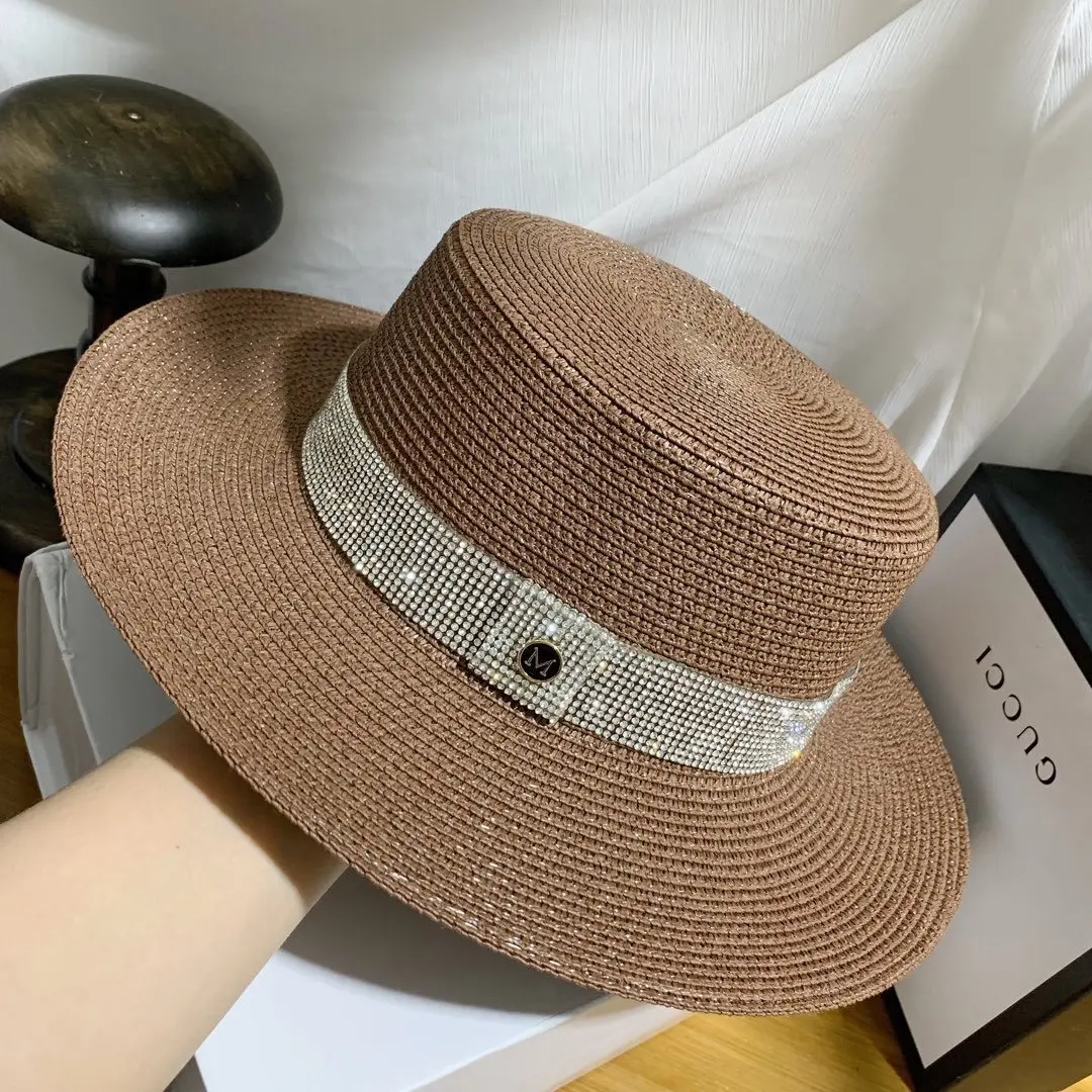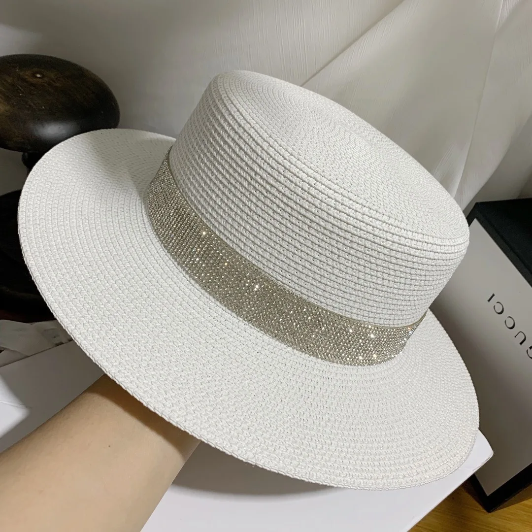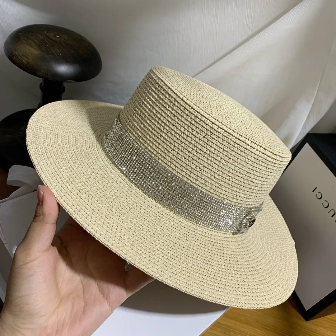 Sun Hat Artificial Diamond Belt Straw Hat Retro Gold Braided Hat Female Loose Sunscreen Sunshade Flat Cap Visors Hats Church Hat