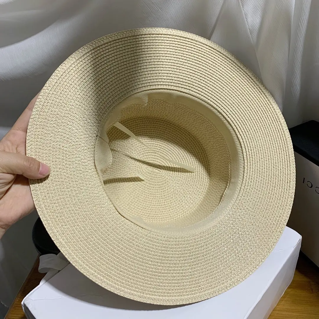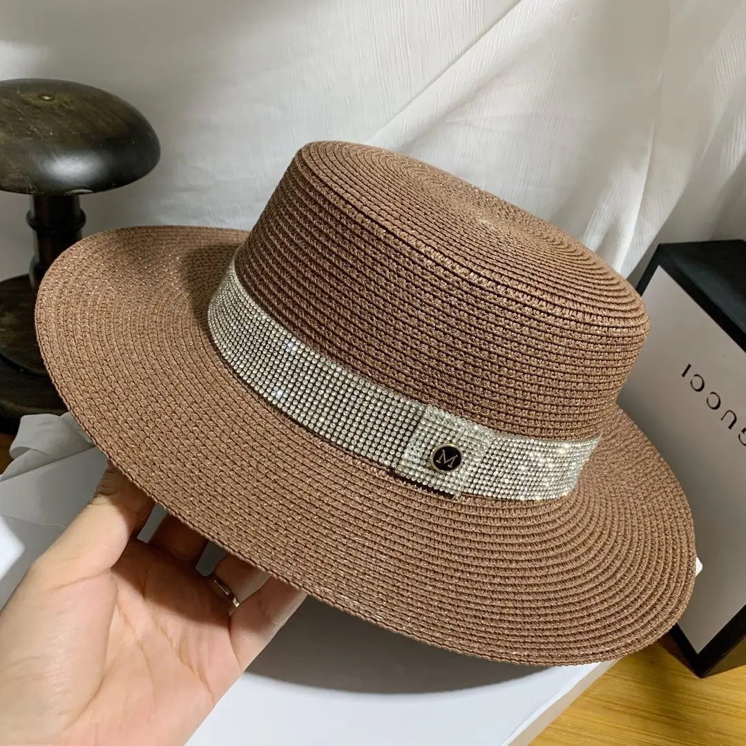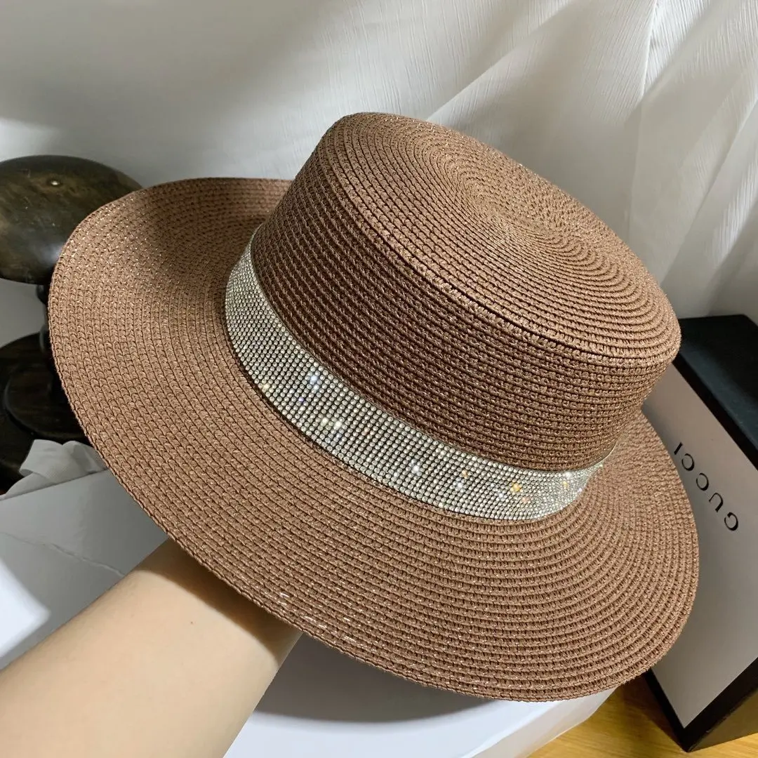 Sun Hat Artificial Diamond Belt Straw Hat Retro Gold Braided Hat Female Loose Sunscreen Sunshade Flat Cap Visors Hats Church Hat