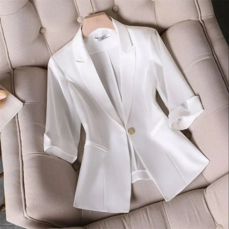Acetic Wcid Stretch Satin Slim Waist Joker Blazer Women Summer Net Red Slim Cropped Sleeve Professional Pure Colour Suit Jacket