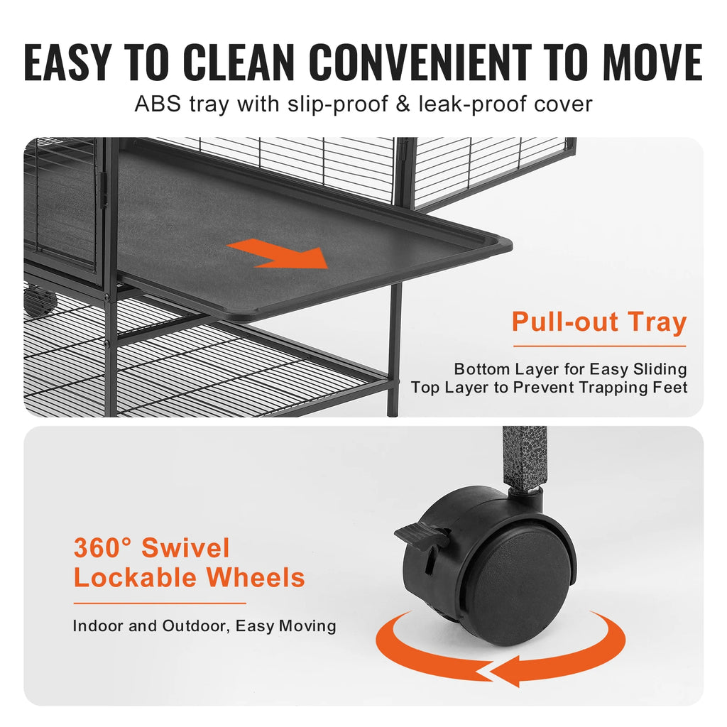 With 3 non-slip ramps and 4 platforms, this critter cage offers easy access for small animals. Flannel-covered ramps provide secure footing, and a hammock adds variety. Double doors and a top window allow convenient feeding. Lockable wheels ensure easy mobility indoors and outdoors.