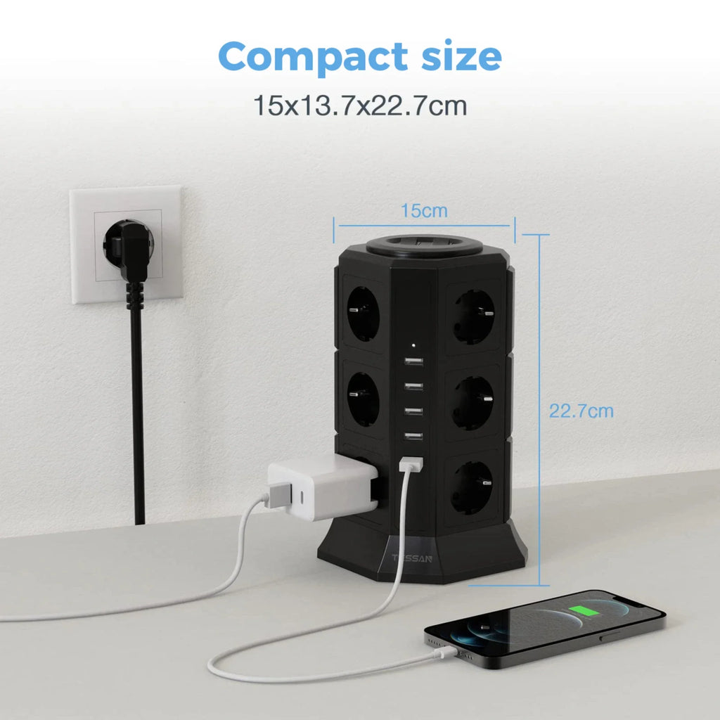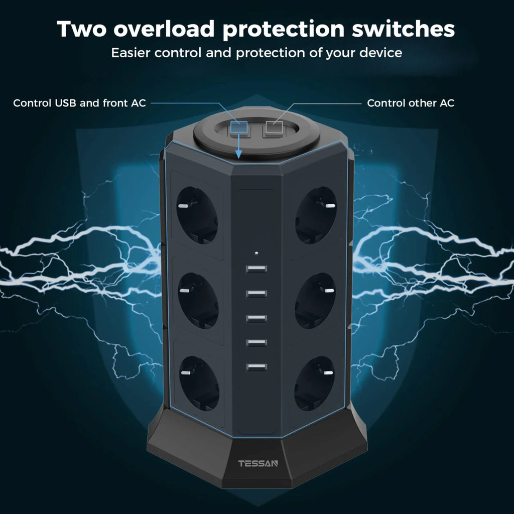 TESSAN Power Strip Vertical Tower Socket 12 Outlets 5 USB Ports EU Plug Multiple Socket with 2M Extension Cord Surge Protection