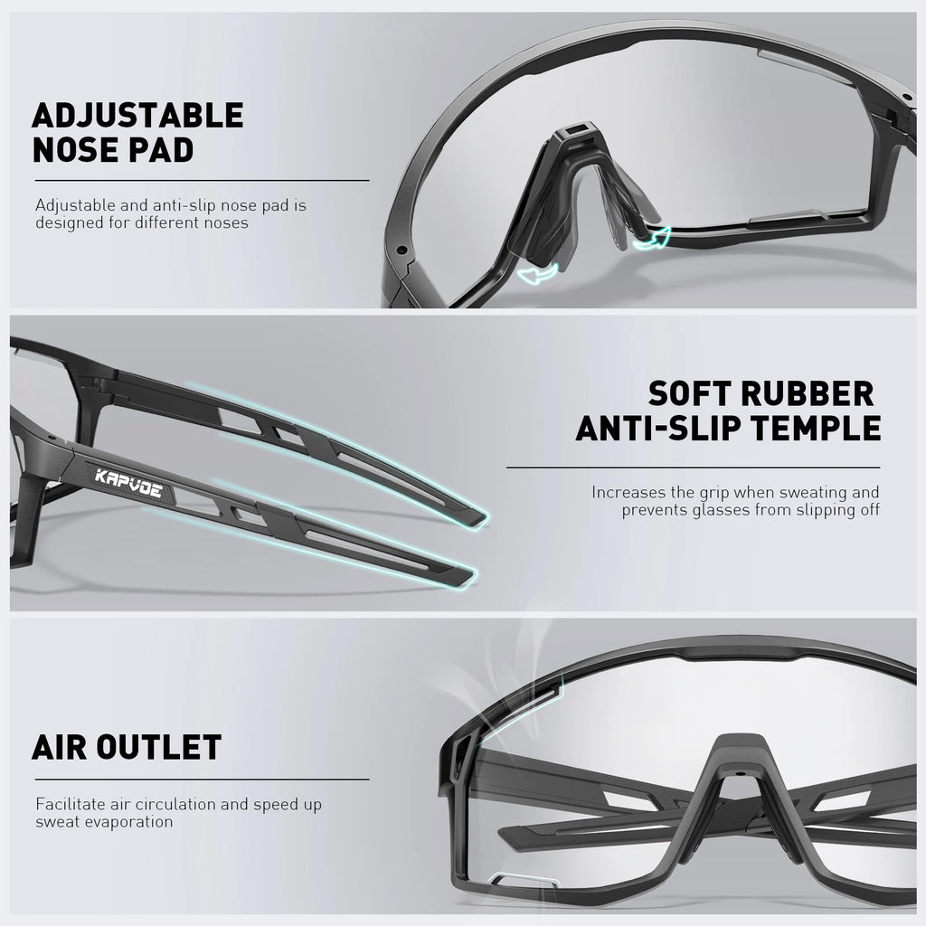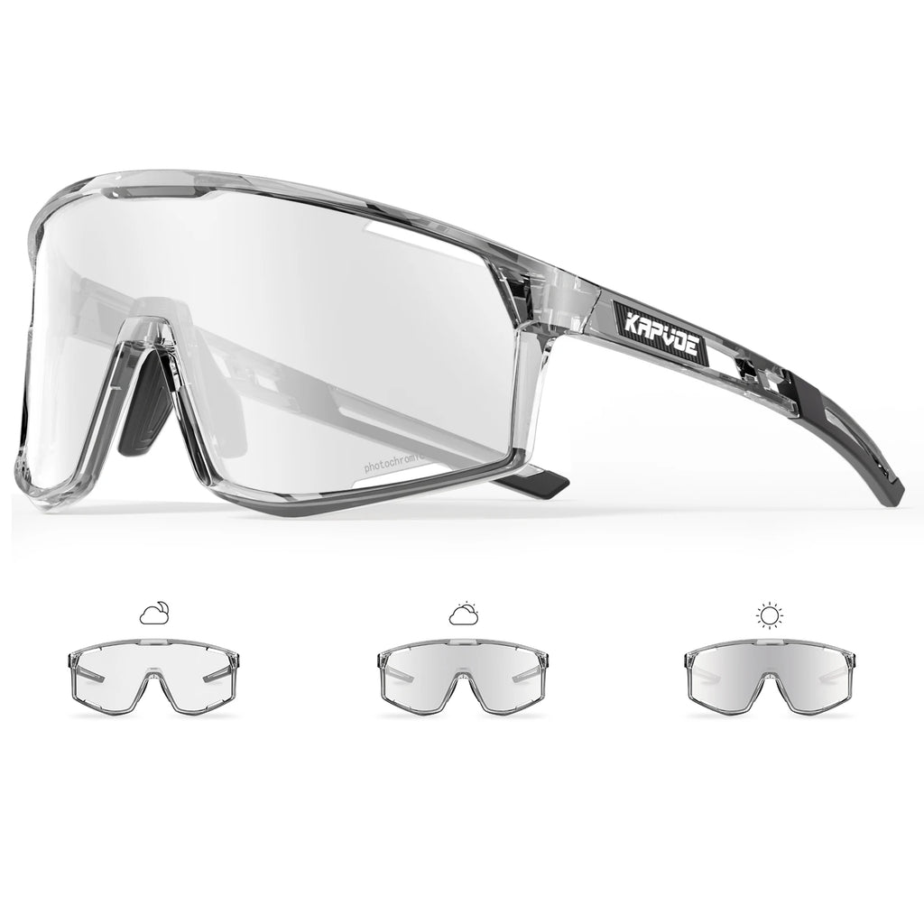 Photochromatic cycling glasses: the photochromic lenses from KAPVOE darken or brighten in response to changes in outdoor light, with a visual light transmission of 15% to 85%. Photochromic sunglasses change from clear to dark grey in sunny conditions and effectively protect the eyes while maintaining a pleasant brightness level.